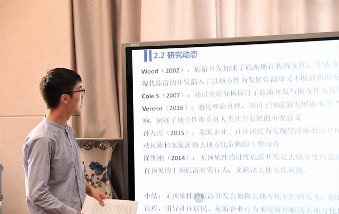 随后,拉斯维加斯3499官网登录入口的汪熠杰同学带来了题为《去地方化危机下的民族村寨旅游开发对策研究——基于演化博弈分析》的论文汇报。他的论文基于演化博弈理论视角构建了复制动态模型,描述了民族村寨旅游利益主体间的博弈均衡状态,进而对民族村寨旅游开发中去地方化问题的解决进行了探讨。