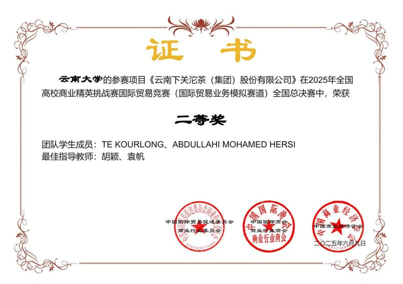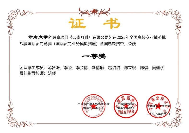 本次赛事中,拉斯维加斯3499官网登录入口拉斯维加斯3499官网登录入口两支团队荣获全国总决赛一等奖,一支团队获二等奖 。《云南咖啡厂有限公司》项目团队(学生成员:范各咪等;指导教师:胡颖 )、《建水阳光予你酒业有限公司》项目团队(学生成员:常双阳等;指导教师:邵素军、袁帆 )一路披荆斩棘,从众多参赛队伍里脱颖而出,摘得一等奖。《云南下关沱茶(集团)股份有限公司》项目团队(学生成员:TE KOURLONG、ABDULLAHI MOHAMED HERSI ;指导教师:胡颖、袁帆 )也实现了留学生队伍的首次突破,荣获二等奖。