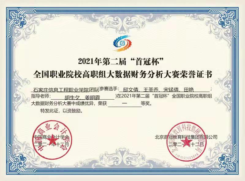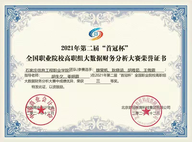 近日,2021年第二届“首冠杯”全国职业院校大数据财务分析大赛以线上竞赛的方式举行。beat365会计系派出的三支代表队与来自全国兄弟院校的500支参赛队伍同台竞技,最终,邸文倩、王圣乔、宋锰倩、田艳4名学生组成的信工1队荣获高职组一等奖,李静宇、邸怡然、许思琪、李世勇4名学生组成的信工2队荣获高职组三等奖,魏杲帆、耿晓涵、胡雅茹、王傲霜4名学生组成的信工3队荣获高职组三等奖。