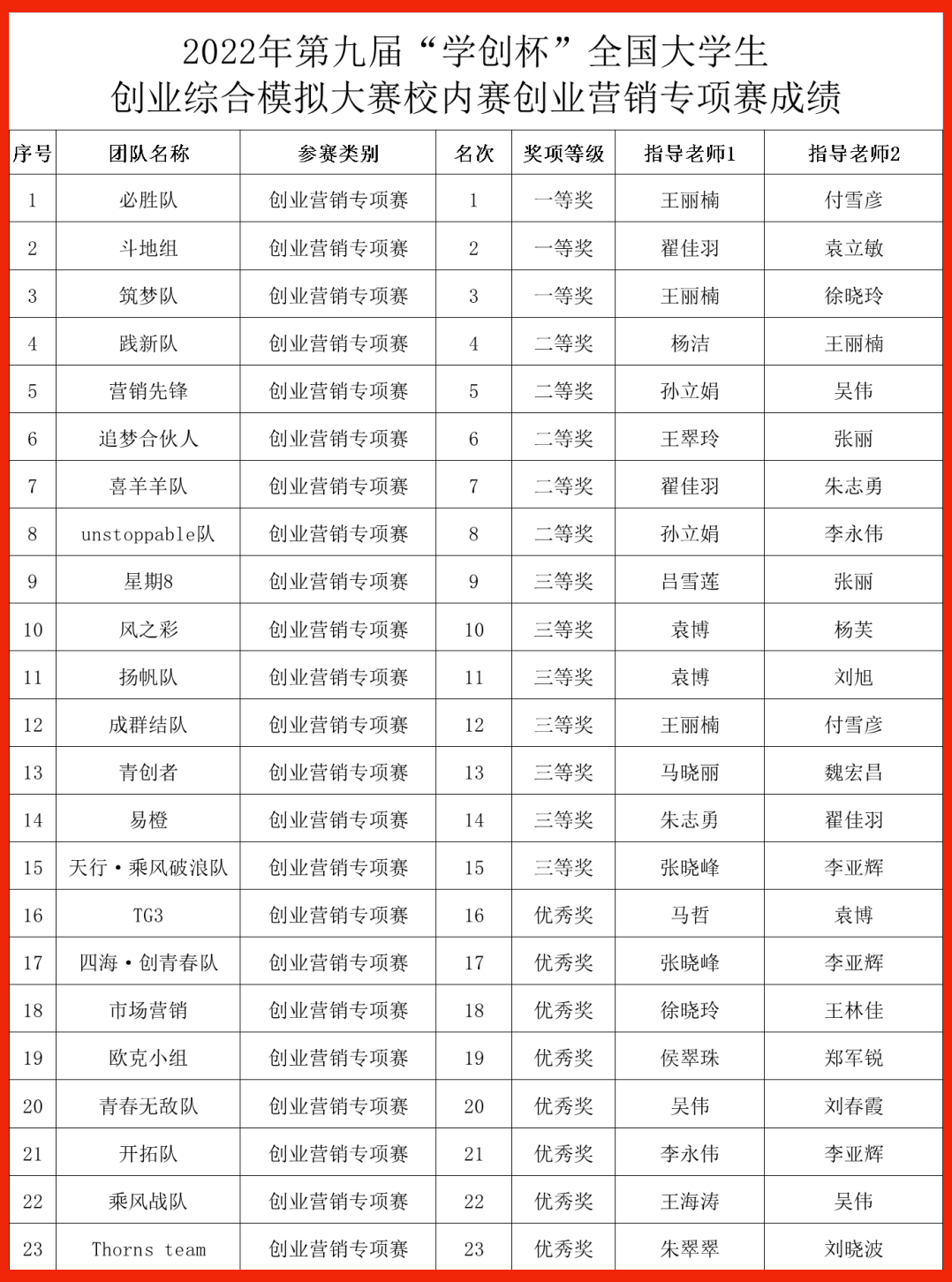 此次校内选拔赛吸引了来自传媒艺术系、经济贸易系、会计系、管理系、软件工程系、计算机应用系的43支队伍参赛,参赛人数为129人。经过四个多小时的激烈角逐,最终传媒艺术系的“巳午工作室”“Infinte possible队”“想给你一个家”获得主体赛一等奖;传媒艺术系的“必胜队”“斗地组”“筑梦队”获得创业营销专项赛一等奖。以上一等奖获奖团队将推荐参加省级选拔赛。另外,两条赛道各有5个团队获得二等奖、7个团队获得三等奖。同时,获得一等奖的团队指导教师荣获“最佳指导教师”称号,获得二、三等奖的团队指导教师荣获“优秀指导教师”称号。