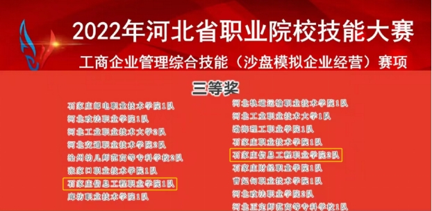 由河北省教育厅主办、河北省现代服务业职业教育集团承办的2022年河北省职业院校学生技能大赛(高职)工商企业管理综合技能(沙盘模拟企业经营)大赛以线上竞赛的方式举行。beat365会计系周同瑶老师和王丽莉老师,带领大数据与会计专业董冰茜、杨笑雨、崔亚南、钱思羽、徐敬5名同学组成的beat365英国官网1队,和方俊杰、贾一卓、吴东旺、李兆康、叶微5名同学组成的beat365英国官网2队分别荣获三等奖。