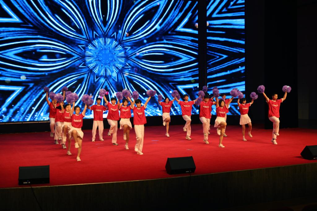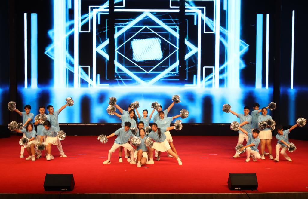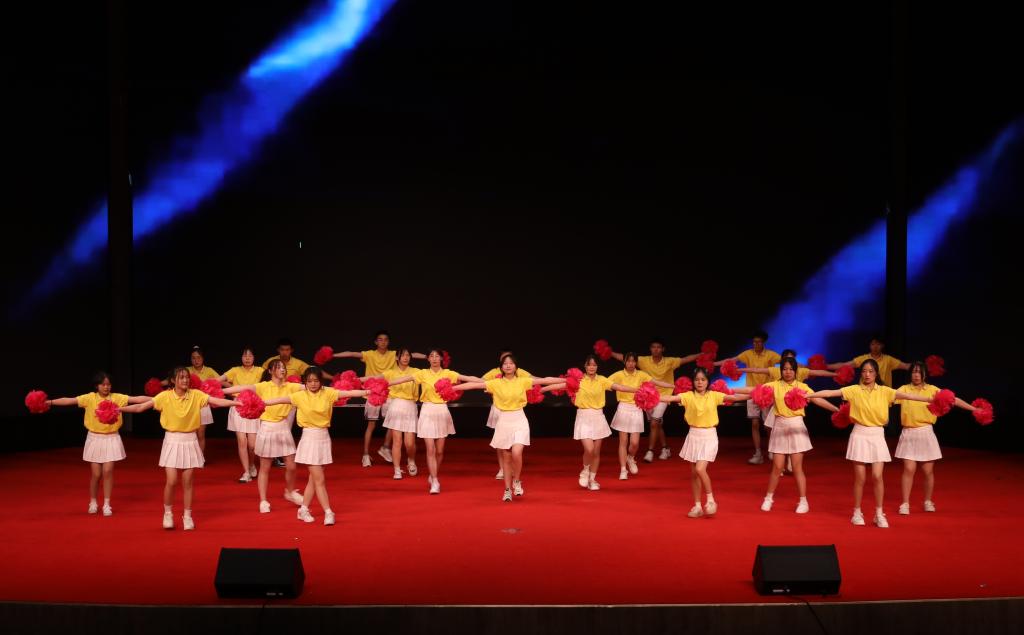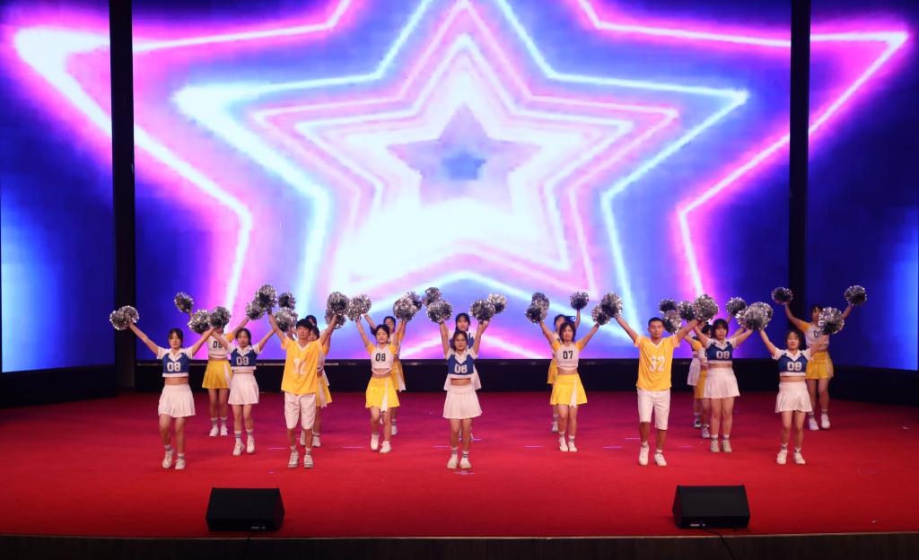 穿着靓丽服装的队员们在舞台上跟着动感的音乐,挥舞着五彩的啦啦球,动作强劲有力,整齐划一,活力四射,充满激情,充分展现了当代大学生健康向上、青春洋溢的精神风貌,为观众呈现了一场充满动感与活力的视觉盛宴。