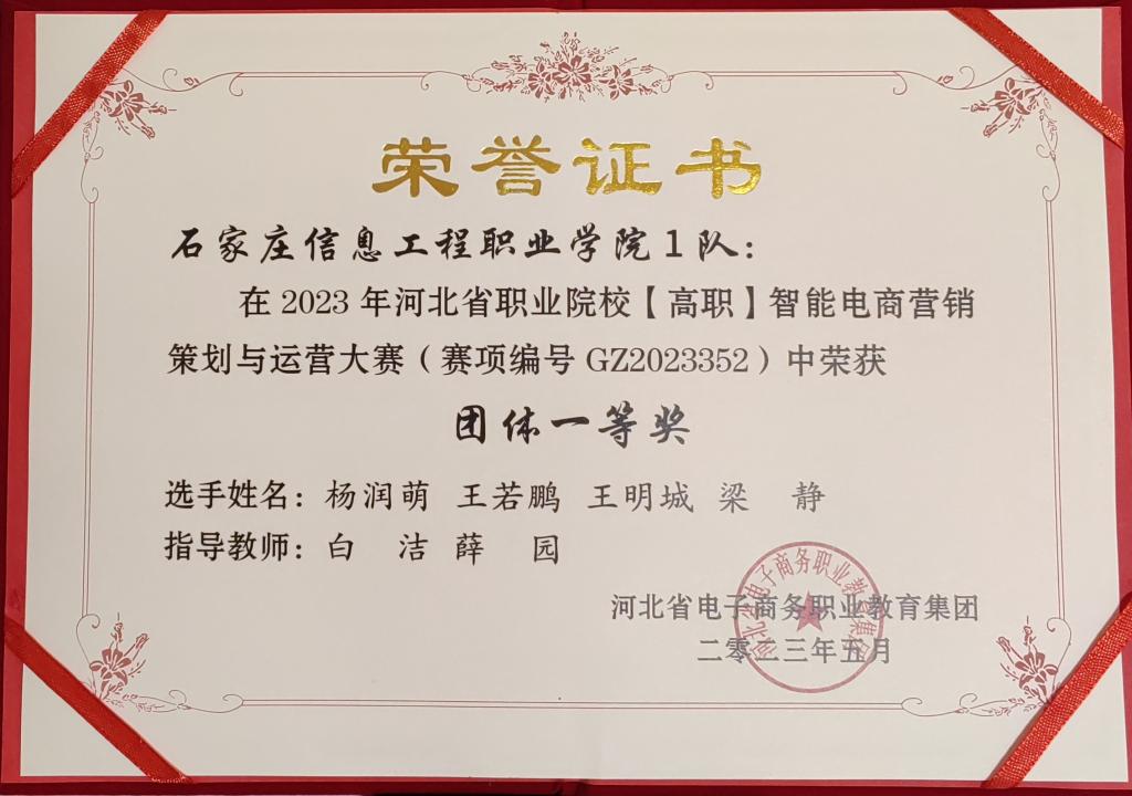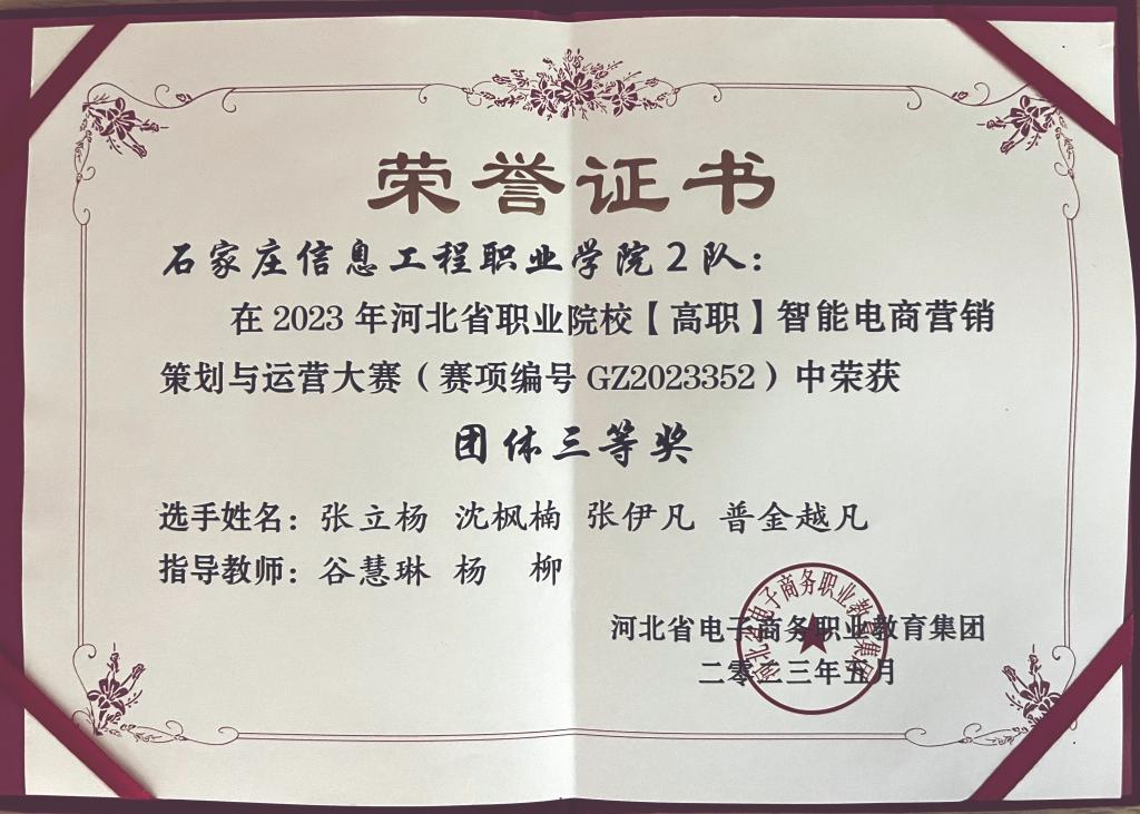 5月28日,2023年河北省高等职业院校智能电商营销策划与运营大赛在河北政法学院圆满落幕。来自全省职业院校的53支代表队参加竞赛。经济贸易系市场营销专业学生杨润萌、王若鹏、王明城、梁静组成的beat3651队荣获河北省团体一等奖;电子商务专业学生张立杨、沈枫楠、张伊凡、普金越凡组成的beat3652队荣获河北省团体三等奖。