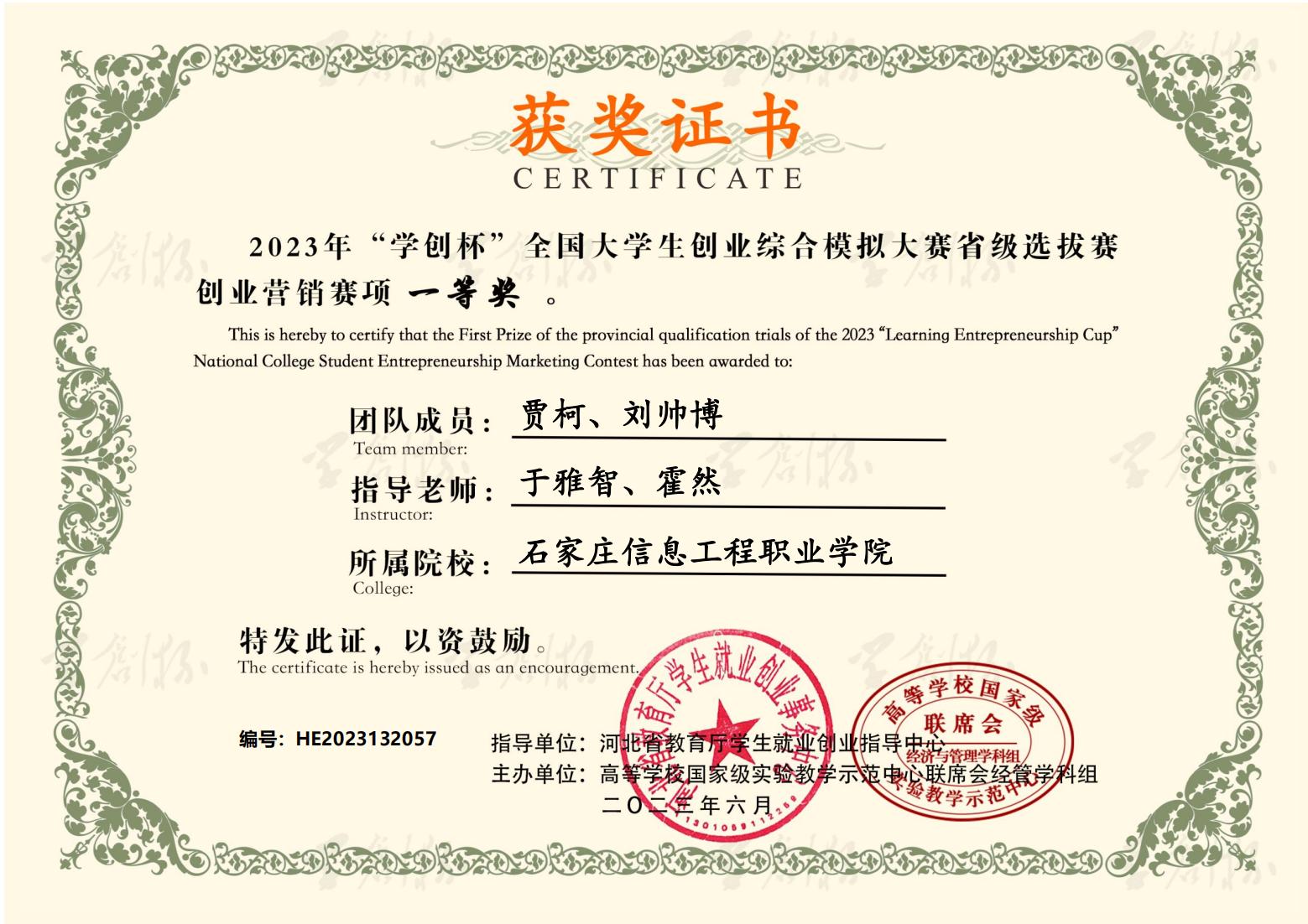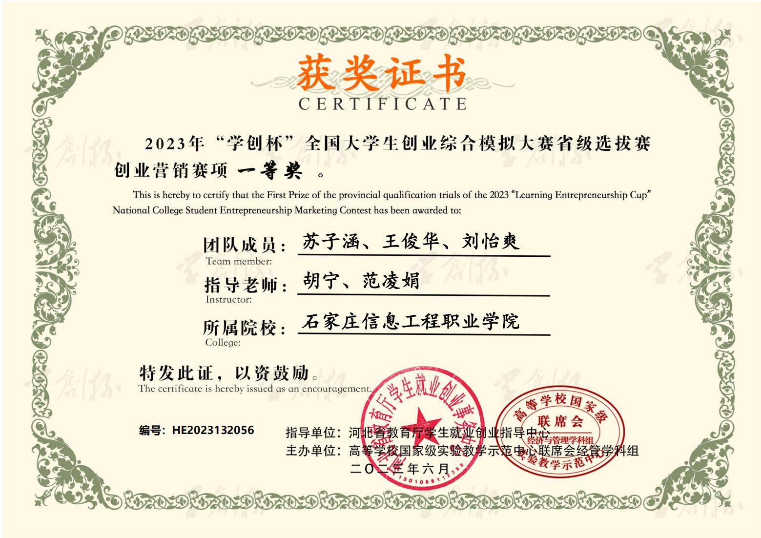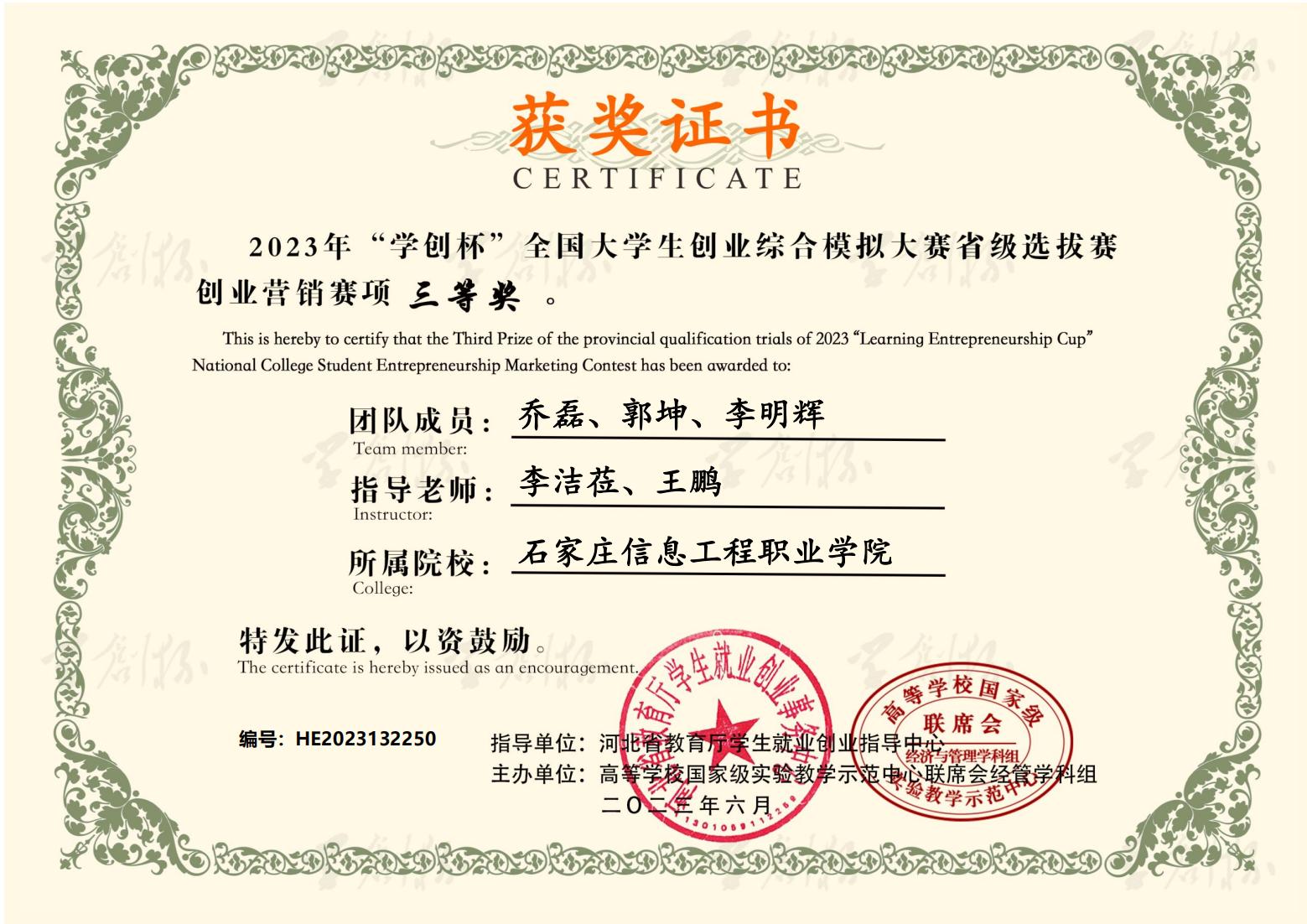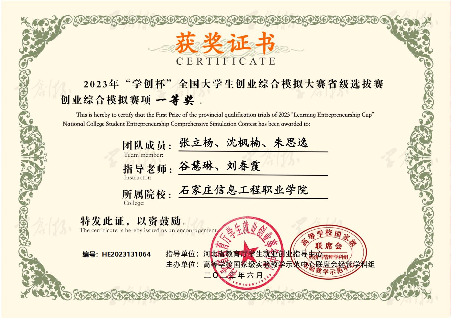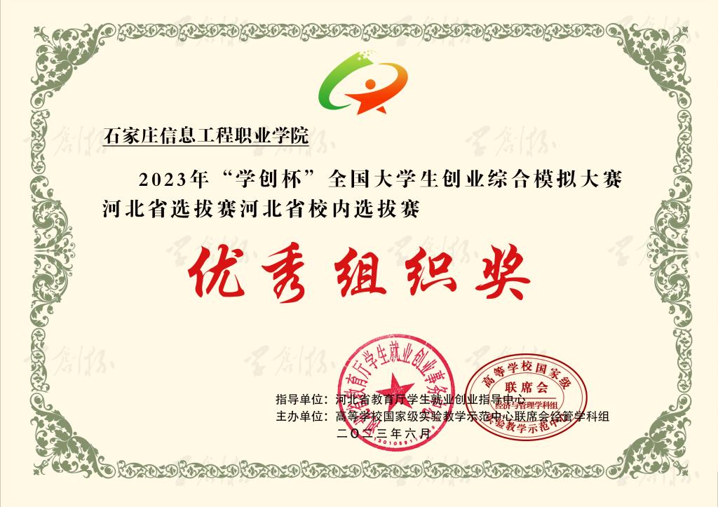 近日,2023年“学创杯”全国大学生创业综合模拟大赛河北省选拔赛圆满落幕。大赛启动以来,beat365积极响应,精心组织,经过校内选拔赛和省赛的激烈角逐,六支参赛队伍共获得一等奖3个,二等奖1个,三等奖2个。同时,获得一等奖的团队指导教师荣获“最佳指导教师”称号,获得二、三等奖的团队指导教师荣获“优秀指导教师”称号。beat365荣获优秀组织奖。
