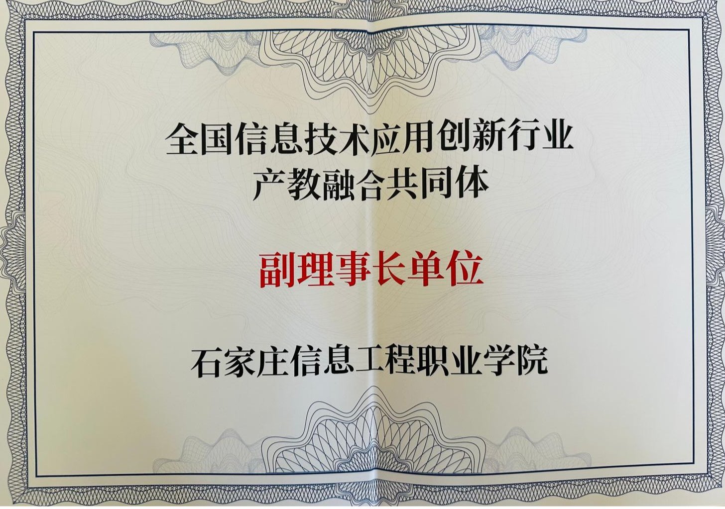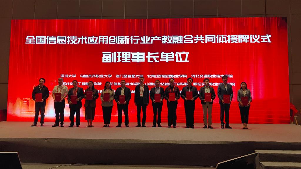 ▲图为全国信息技术应用创新行业产教融合共同体成立大会。网络与通信工程系主任唐磊(左六)接受授牌。
