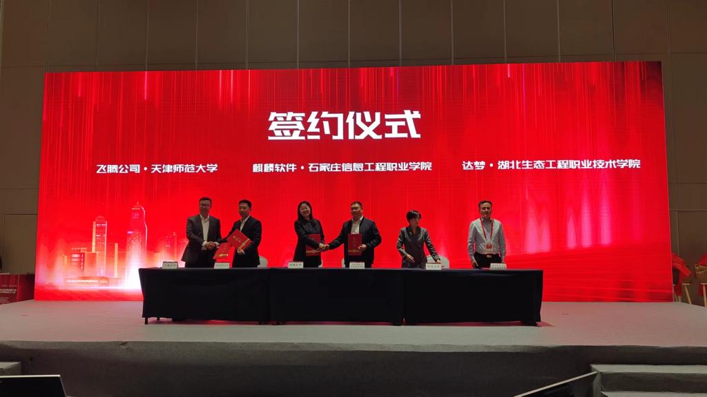 ▲图为全国信息技术应用创新行业产教融合共同体成立大会现场。网络与通信工程系主任唐磊(右三)签约。