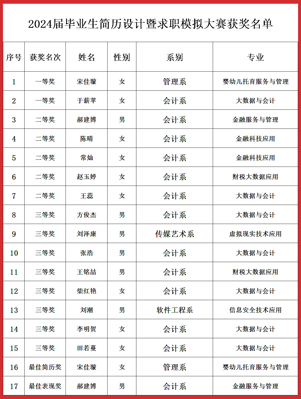 此次大赛,为参赛选手提供了良好的自我展示平台,积累了简历撰写、设计及求职模拟等方面的宝贵经验,为提高职业素质和求职能力,提升就业竞争力,实现顺利就业打下了良好的基础。
