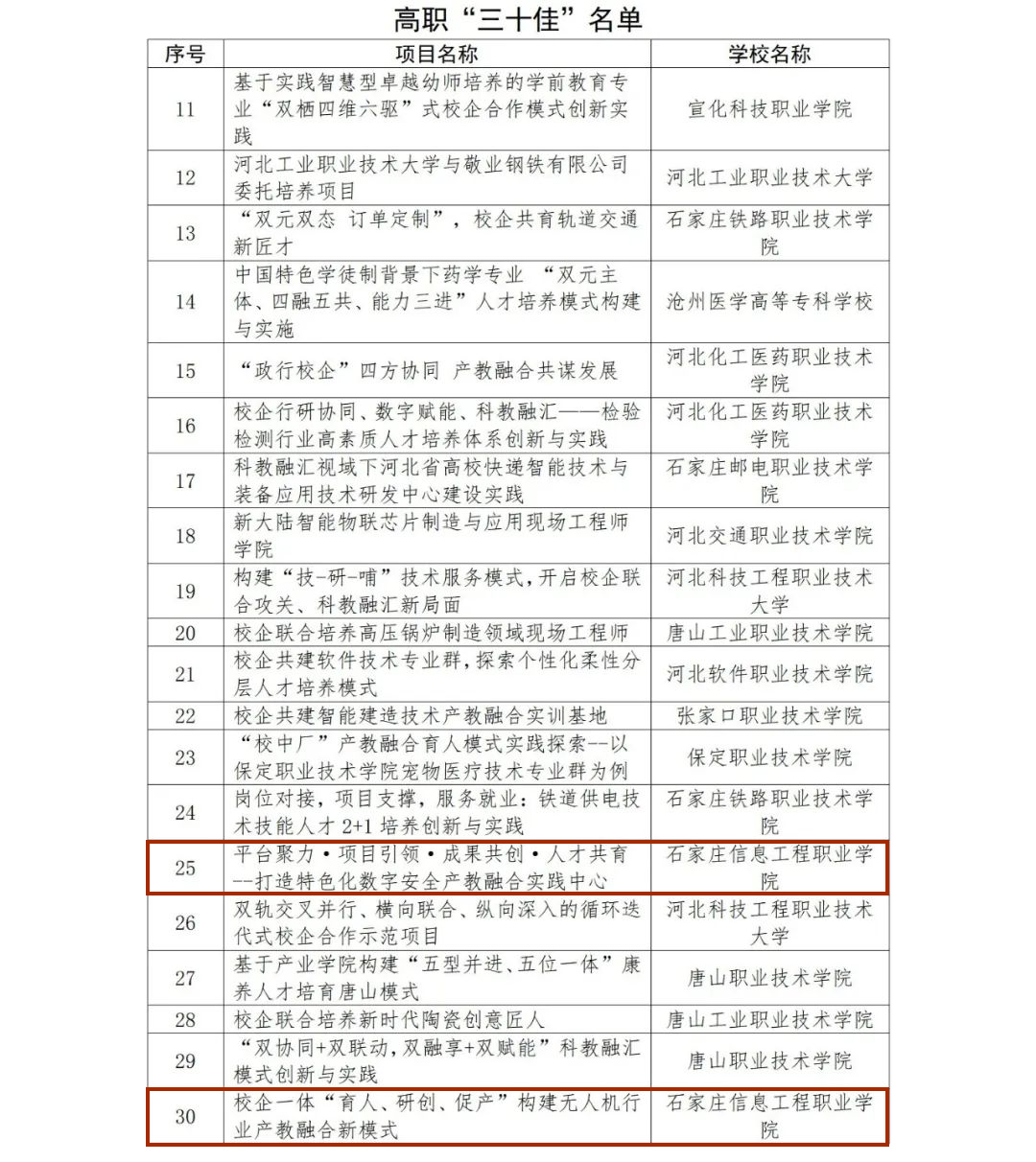 近日,河北省教育厅公布了2023年度河北省职业教育校企合作示范项目“十佳”“三十佳”“五十佳”名单。学院与北京天融信网络安全技术有限公司联合实施的“平台聚力·项目引领·成果共创·人才共育——打造特色化数字安全产教融合实践中心”项目,与河北鹰览自动化科技有限公司协同开展的“校企一体‘育人、研创、促产’构建无人机行业产教融合新模式”项目,从全省130个高职遴选项目中脱颖而出成功入选“三十佳”。