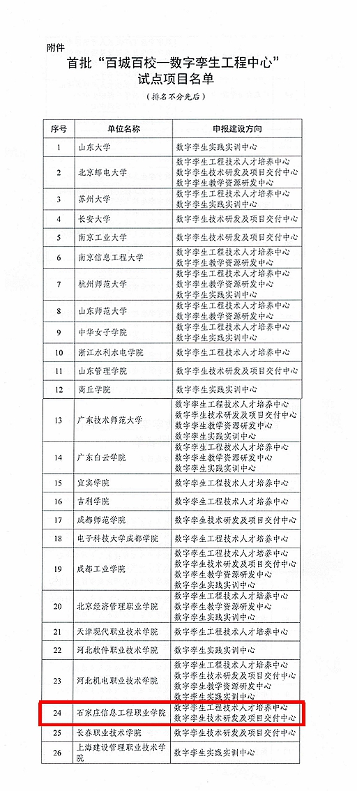 “百城百校——数字孪生工程中心”试点项目是由国家工业信息安全发展研究中心牵头,并按照《中华人民共和国职业分类大典(2022年版)》以及人力资源和社会保障部《提升全民数字技能工作方案》等相关要求,围绕数字孪生领域人才培养、技术研发、教学研发、实践实训等四个方向开展的项目建设,是为深入贯彻党的二十大精神和习近平总书记关于做好新时代人才工作的重要思想,落实了党中央、国务院《关于加强新时代高技能人才队伍建设的意见》的重要举措。