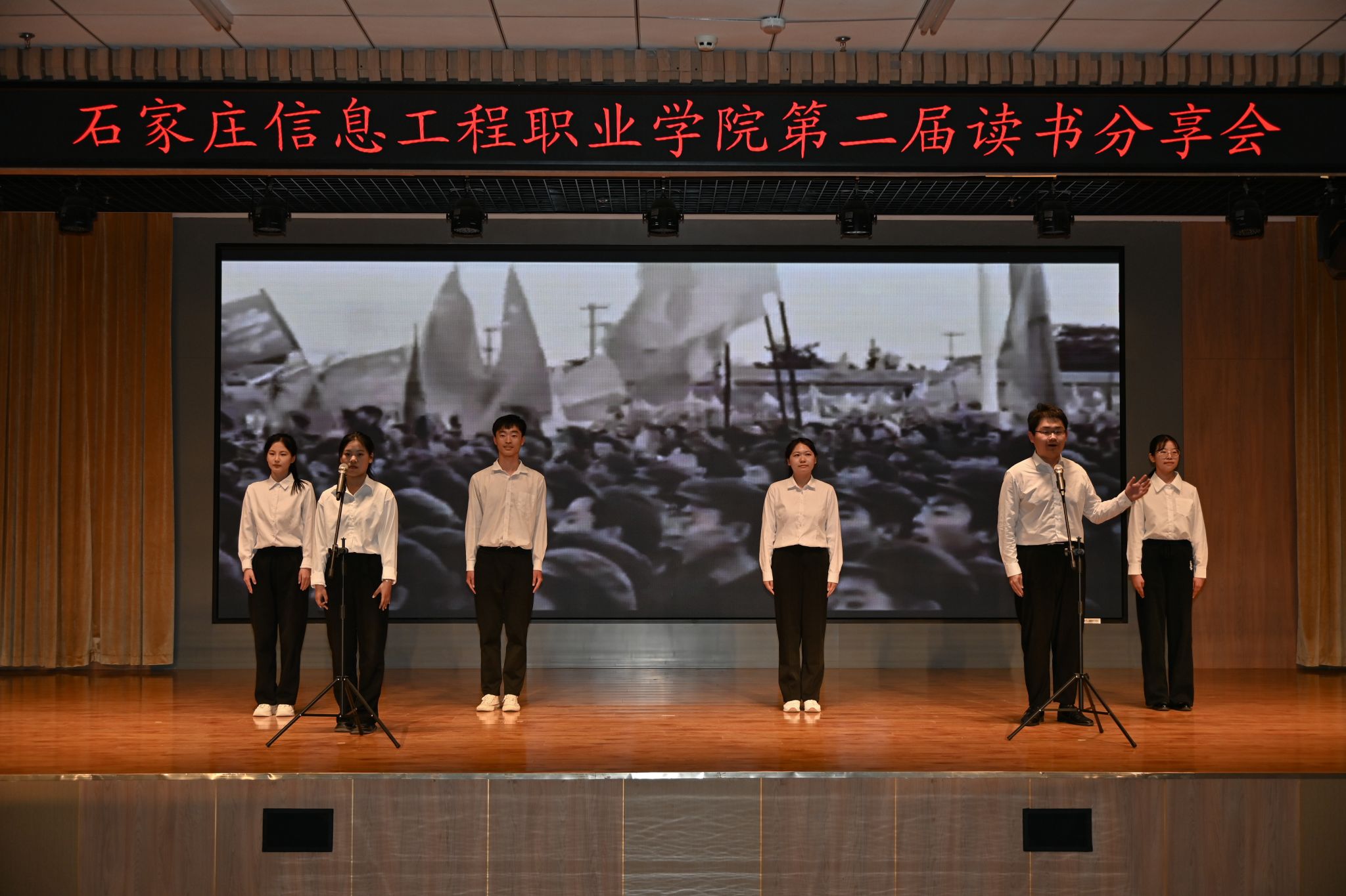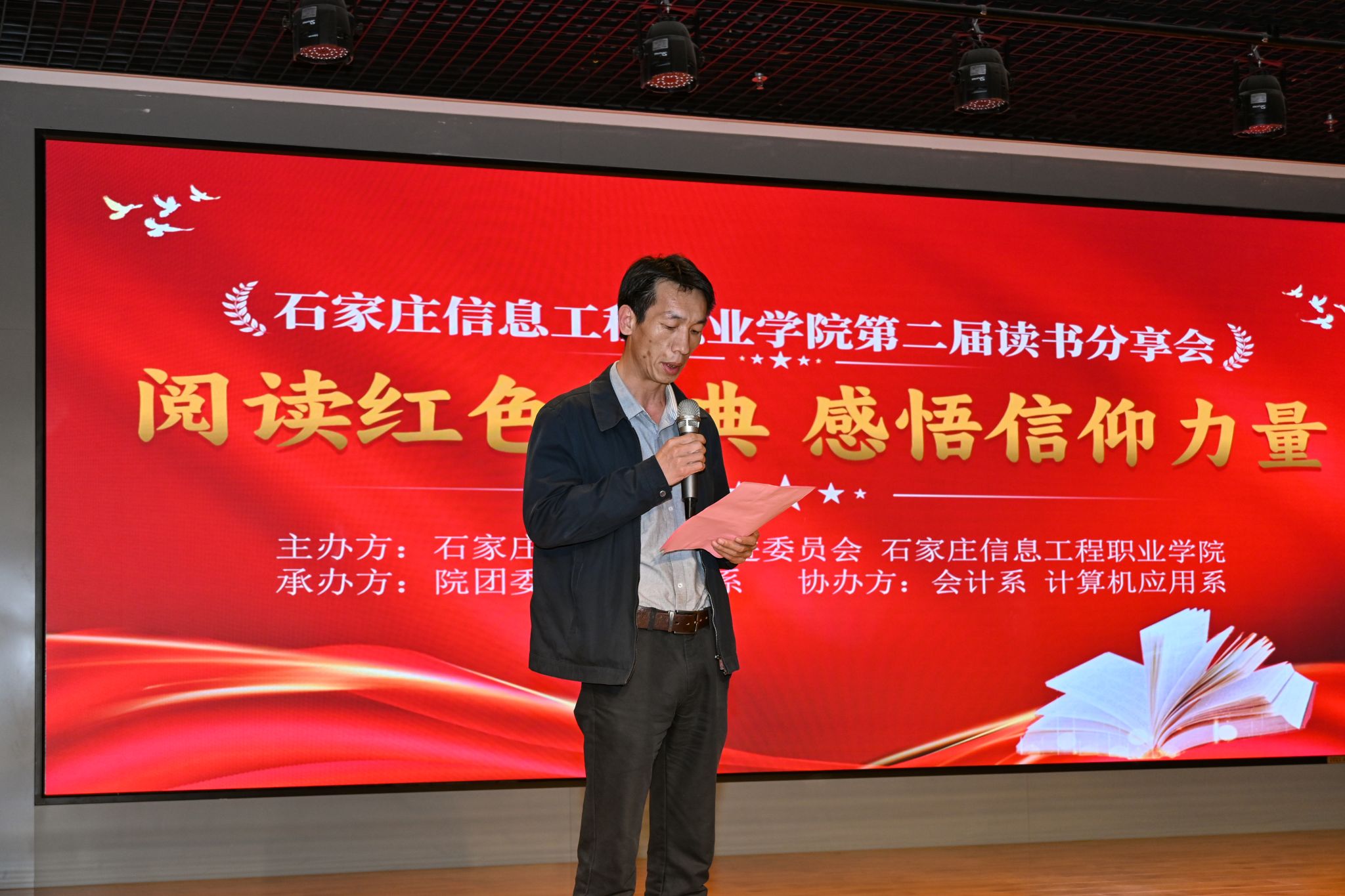最美人间四“阅”天,正是青春读书时。在这个万物生长的季节,我们迎来第29个“世界读书日”。为进一步引导广大青年爱读书、读好书、善读书,营造校园浓郁的读书氛围,进一步激发学生的读书热情,4月24日,由beat365和石家庄市全民阅读促进委员会主办,学院团委与传媒艺术系承办,会计系与计算机应用系协办的“阅读红色经典 感悟信仰力量”第二届读书分享会在图书馆一楼报告厅举办。学院学生处处长、院团委书记展庆召,河北省社区服务促进会副会长王雷东出席。