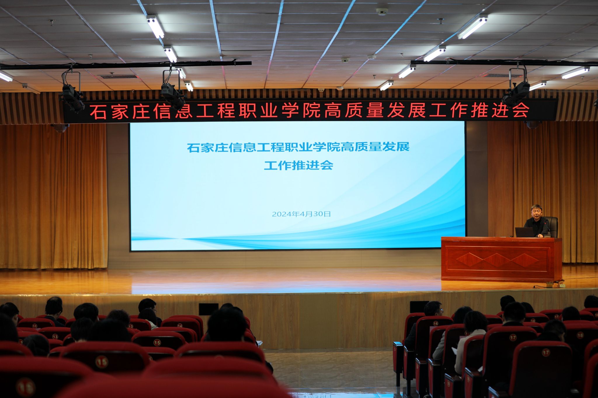 4月30日上午,学院高质量发展工作推进会在图书馆报告厅召开。院长许征程主持会议并讲话,学院领导班子成员参加会议。