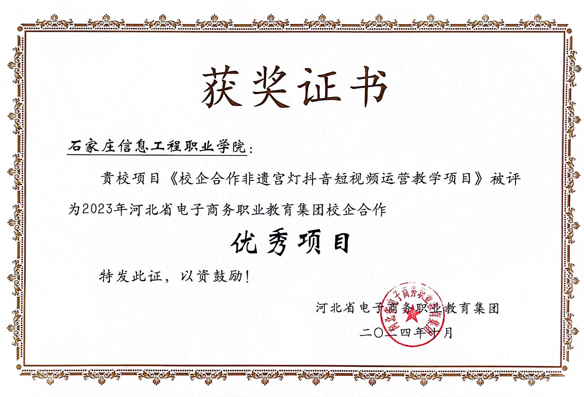 河北省电子商务产教融合共同体由石家庄邮电职业技术学院、河北科技大学、河北鸿科经纬科技有限公司共同发起成立,来自全省的近百家院校和企业参加。会上,同期为河北省电子商务职教集团第二届理事会成员单位授牌,beat365被选为职教集团副理事长单位。同时,beat365《校企合作非遗宫灯短视频运营教学项目》被评为2023年河北省电子商务职教集团校企合作优秀项目,王素娟老师被评为2023年河北省电子商务职教集团校企合作先进个人。
