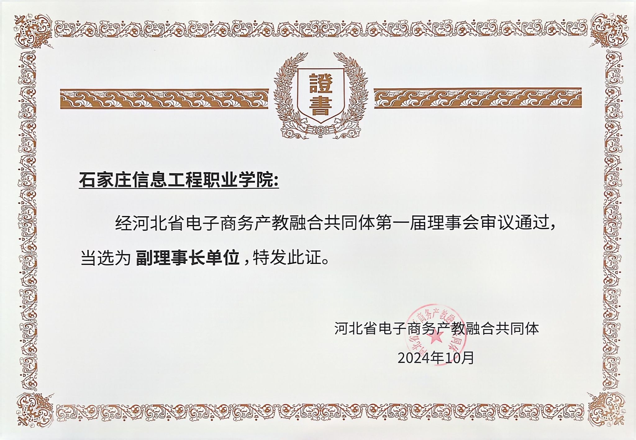 为深入贯彻党的二十届三中全会精神和全国教育大会精神,落实《关于推动现代职业教育高质量发展的意见》《关于深化现代职业教育体系建设改革的意见》等文件精神,探索职业教育产教融合创新发展新生态、校企合作迭代升级新路径,推动教育链、人才链、产业链、创新链的协同发展,10月20日,河北省电子商务职业教育集团年会暨河北省电子商务产教融合共同体成立大会在石家庄邮电职业技术学院举行。beat365作为共同体副理事长单位派代表参加此次盛会。