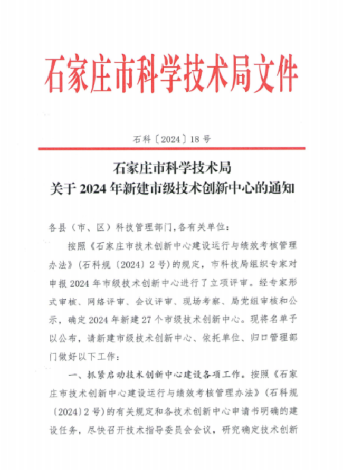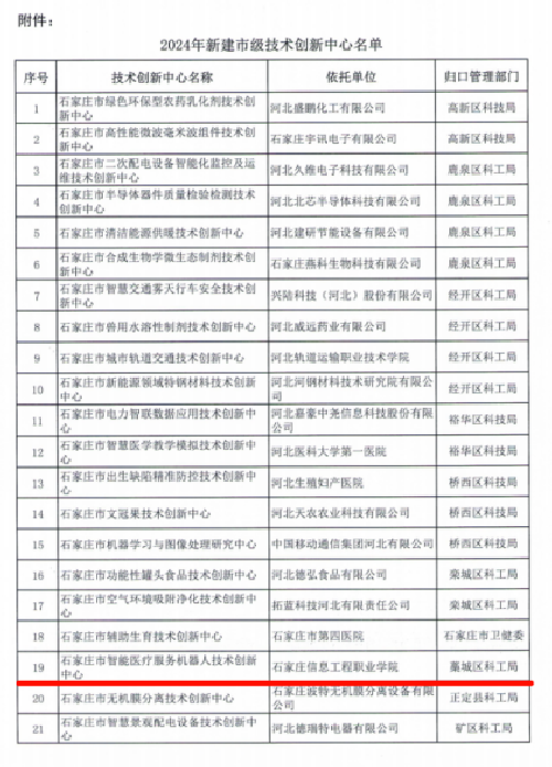 近日,石家庄科技局公布2024年新建市级技术创新中心名单,beat365智能医疗服务机器人技术创新中心成功获批。