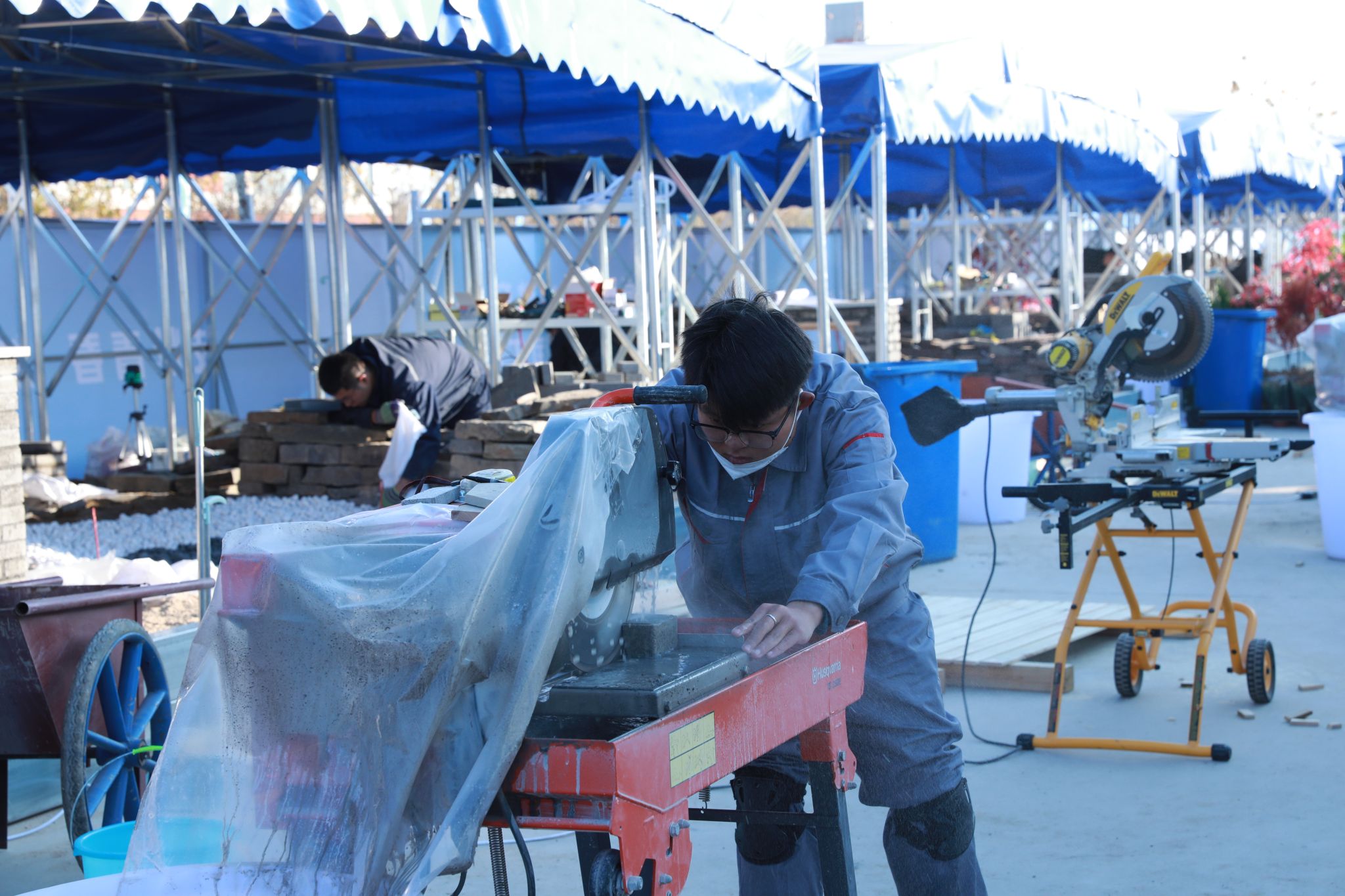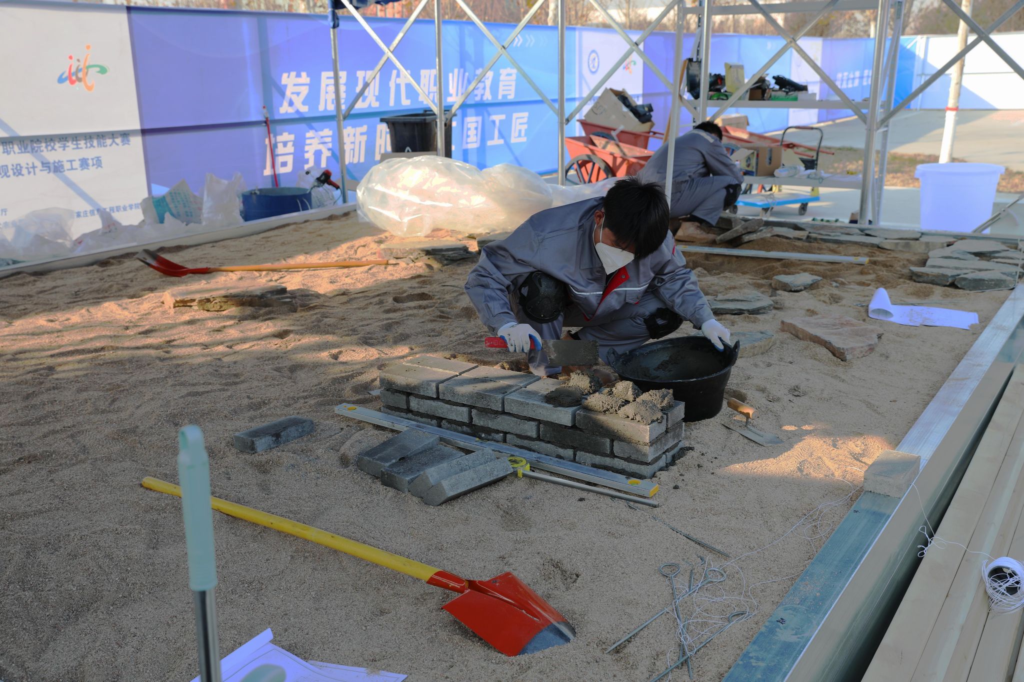 本次赛项设置了“园林景观设计”和“园林景观施工”两个工作任务,旨在全方位考察参赛选手在园林施工图设计、测量、园林工程施工等方面的知识和技能。每支参赛队由4名选手组成,2名设计选手率先在4小时内完成庭院设计平面图、效果图、施工图等近20张图纸,2名施工选手在12小时内完成方案施工,在指定工位上完成木作、砌筑、铺装、水景营造、植物造景等园林景观模块,各模块有机结合组成一件庭院景观作品。是对参赛选手知识、技能技术、责任、体力、精力、耐力和团队协作能力的综合考验。
