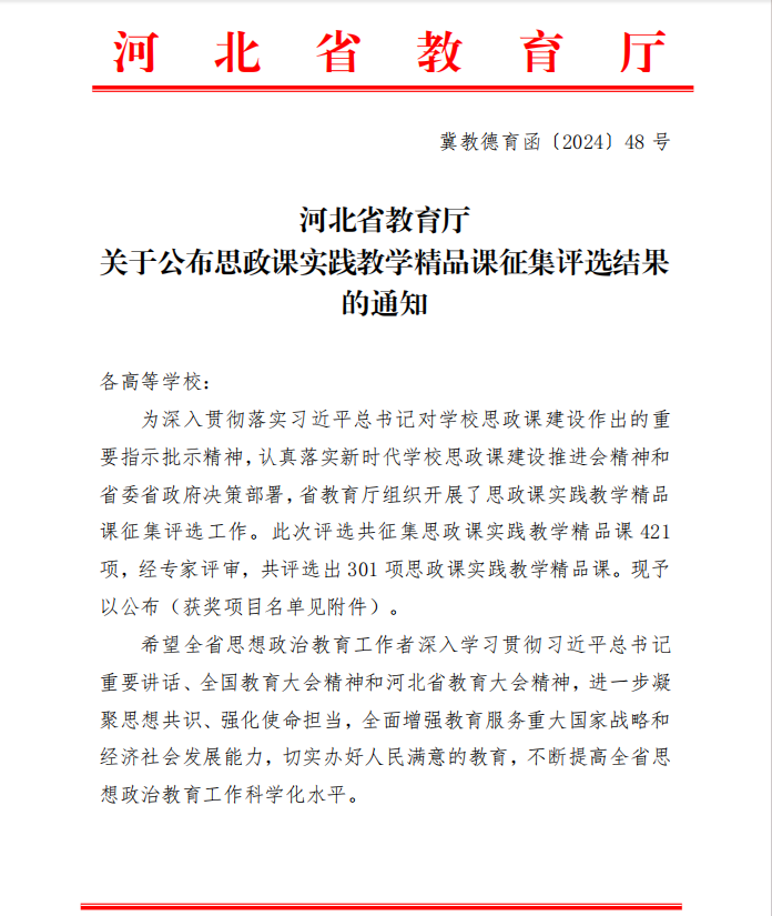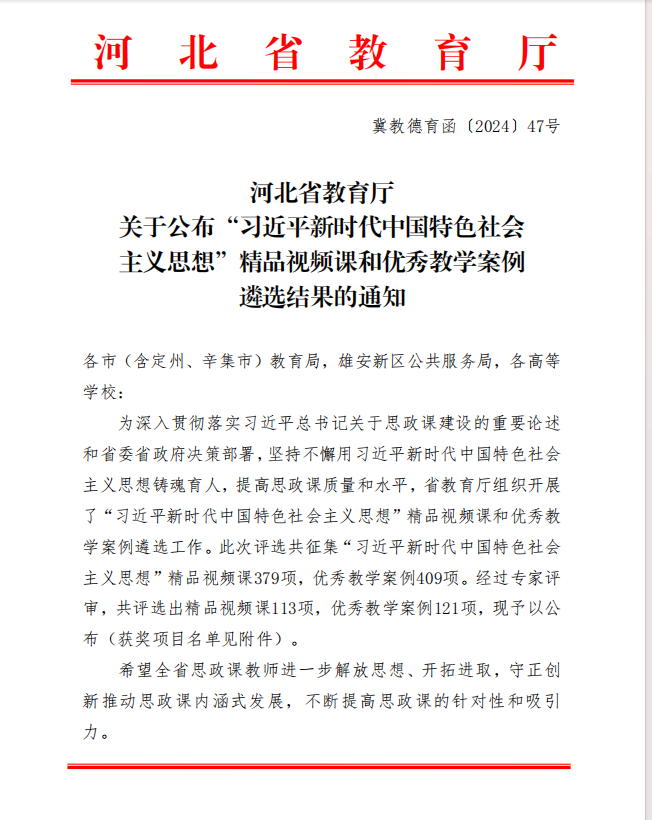 近日,在中共河北省委教育工委、河北省教育厅组织开展的“习近平新时代中国特色社会主义思想”精品视频课和优秀教学案例遴选工作(冀教德育函〔2024〕47号)以及思政课实践教学精品课征集评选工作(冀教德育函〔2024〕48号)中,beat365马克思主义学院选送的1项精品视频课、3项实践教学精品课成功入选。