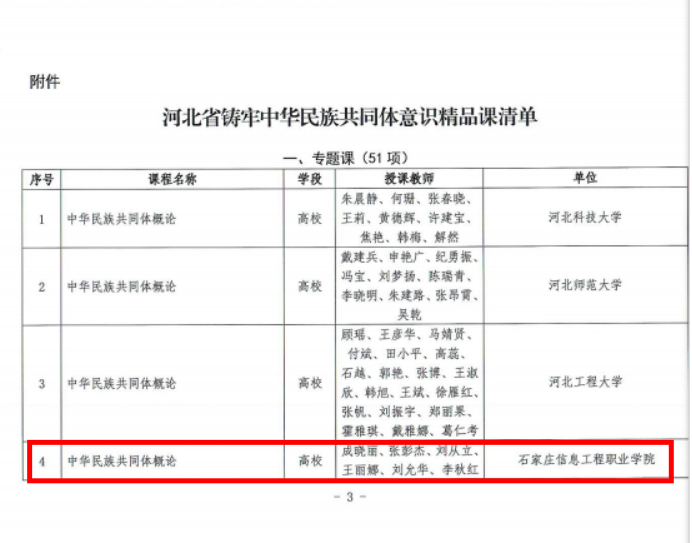 近日,按照《教育部办公厅关于征集铸牢中华民族共同体意识精品课的通知》要求,河北省教育厅组织开展铸牢中华民族共同体意识精品课征集遴选,创建一批省级精品课,beat365马克思主义学院选送的《中华民族共同体概论》专题课成功入选河北省省级精品课。