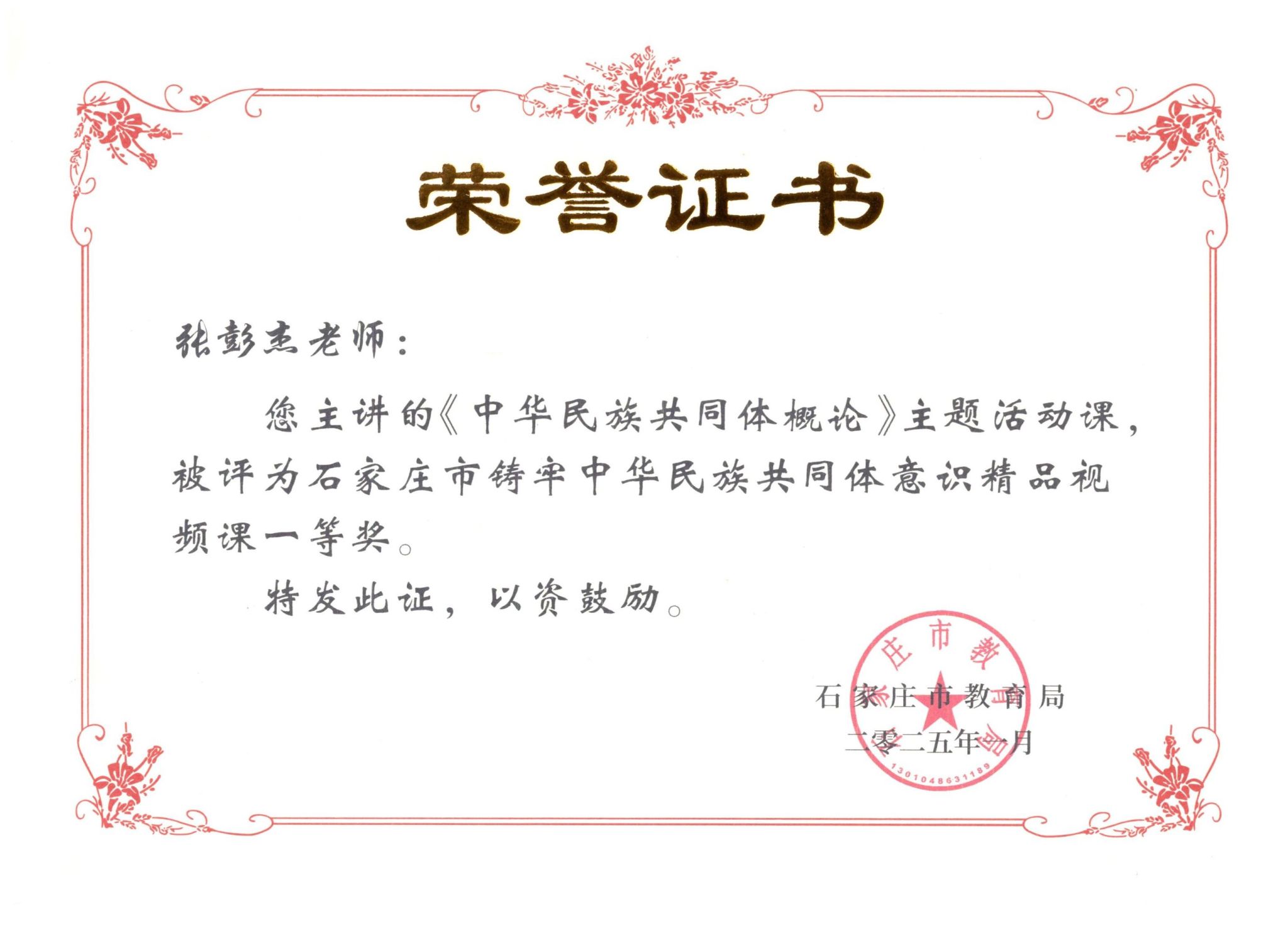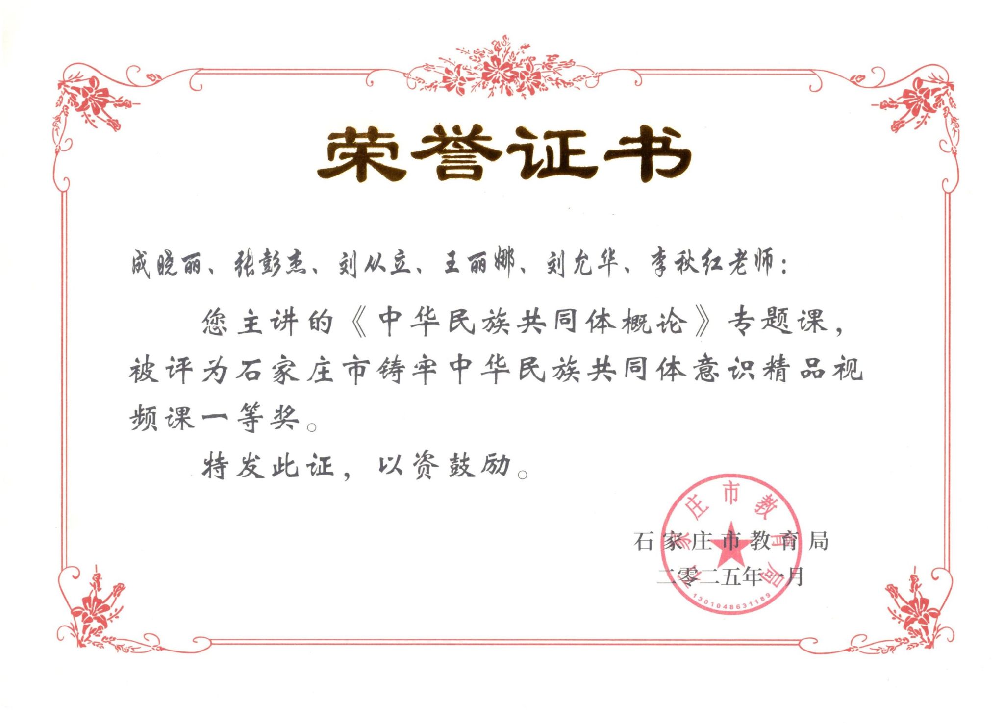 近日,按照《教育部办公厅关于征集铸牢中华民族共同体意识精品课的通知》和《省教育厅关于征集铸牢中华民族共同体意识精品课的通知》(冀教政治函〔2024〕13号)要求,石家庄市教育局组织开展全市铸牢中华民族共同体意识精品课征集遴选工作。beat365马克思主义学院选送的《中华民族共同体概论》专题课、《中华民族共同体概论》主题活动课成功入选石家庄市铸牢中华民族共同体意识精品视频课一等奖。