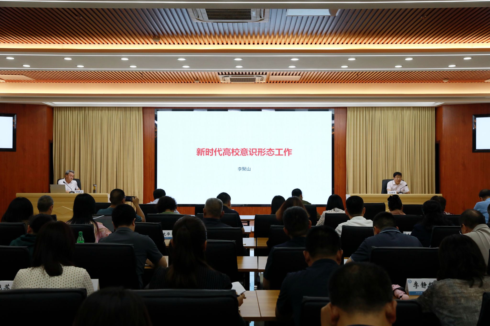 李聚山以《新时代高校意识形态工作》为题,从“意识形态工作”到“高校意识形态工作”,对意识形态的背景、内涵、意义进行了深刻而全面的阐释。他强调,高校工作者要清醒地认识到“学校是意识形态工作的前沿阵地,可不是一个象牙塔,也不是一个桃花源”,要时刻谨记“我们培养人的目标是什么要搞清楚,现在非常明确坚定地提出要培养社会主义建设者和接班人”,确保“强化思想引领,牢牢把握高校意识形态工作领导权”。