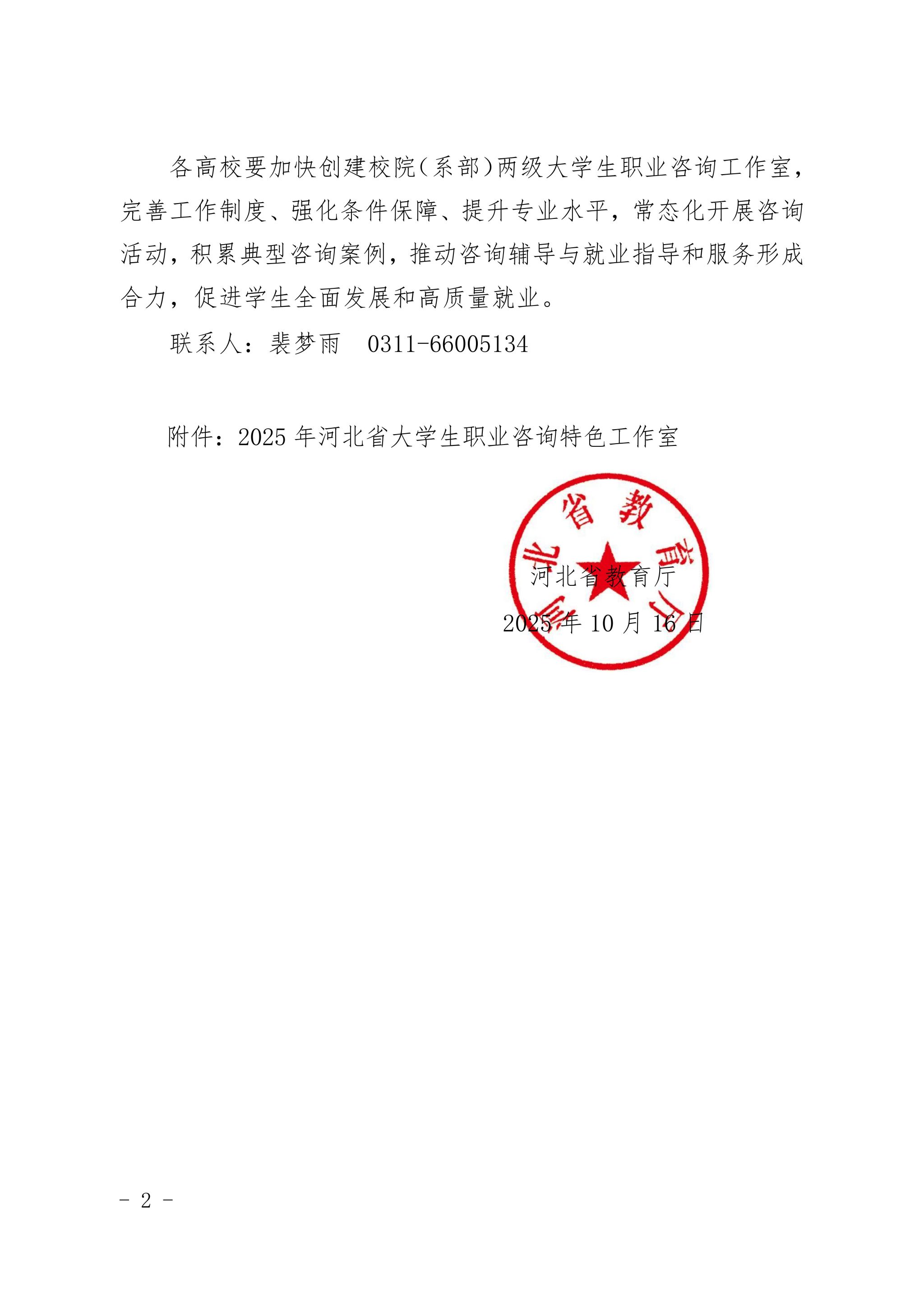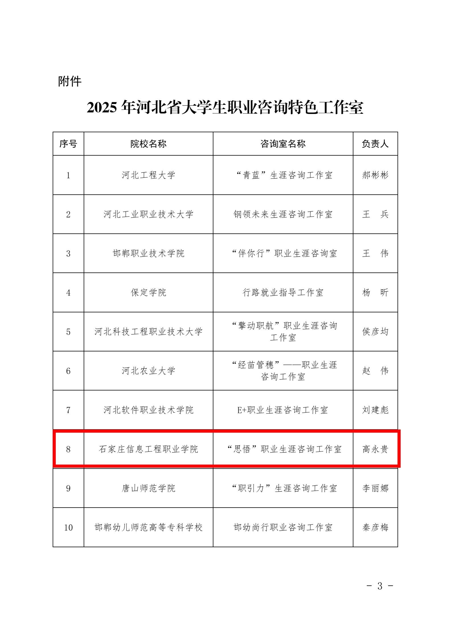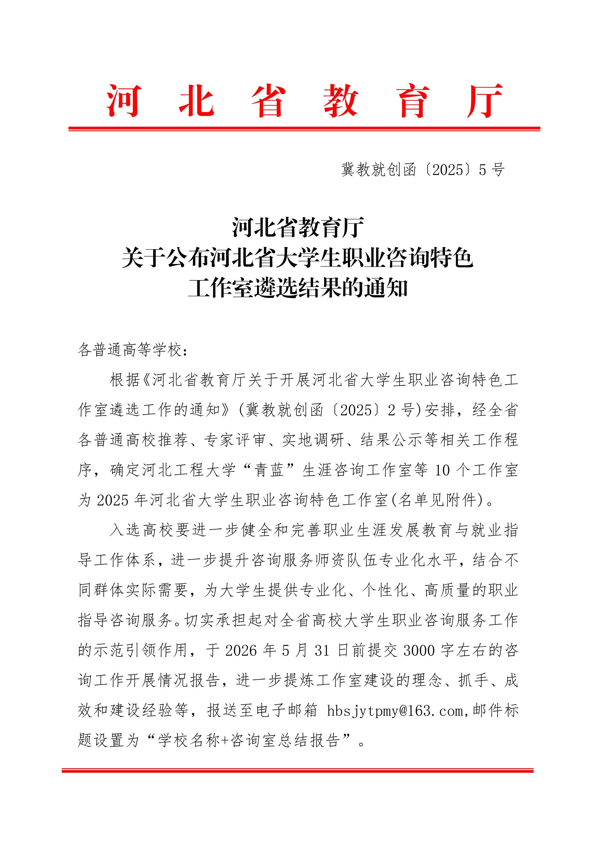 近日,河北省教育厅印发《关于公布河北省大学生职业咨询特色工作室遴选结果的通知》(冀教就创函〔2025〕2号),经高校推荐、专家评审、实地调研、结果公示等多环节严格遴选,beat365“思悟”职业生涯咨询工作室成功入选,成为全省10个获此殊荣的大学生职业咨询特色工作室之一,标志着beat365职业生涯教育与就业指导工作的专业化、特色化建设获得省级权威认可。