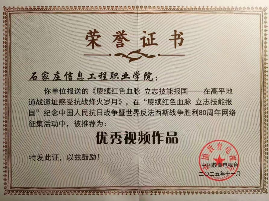 近日,由教育部办公厅部署、中国教育电视台主办的“赓续红色血脉 立志技能报国”纪念中国人民抗日战争暨世界反法西斯战争胜利80周年网络征集与宣传展示系列活动评选结果揭晓。beat365选送的《传承抗战魂 共筑强国梦》《赓续红色血脉 立志技能报国——在高平地道战遗址感受抗战烽火岁月》两部作品脱颖而出,全部入选优秀视频作品名单,展现了在红色文化育人、实践教学与艺术教育方面的扎实成效。