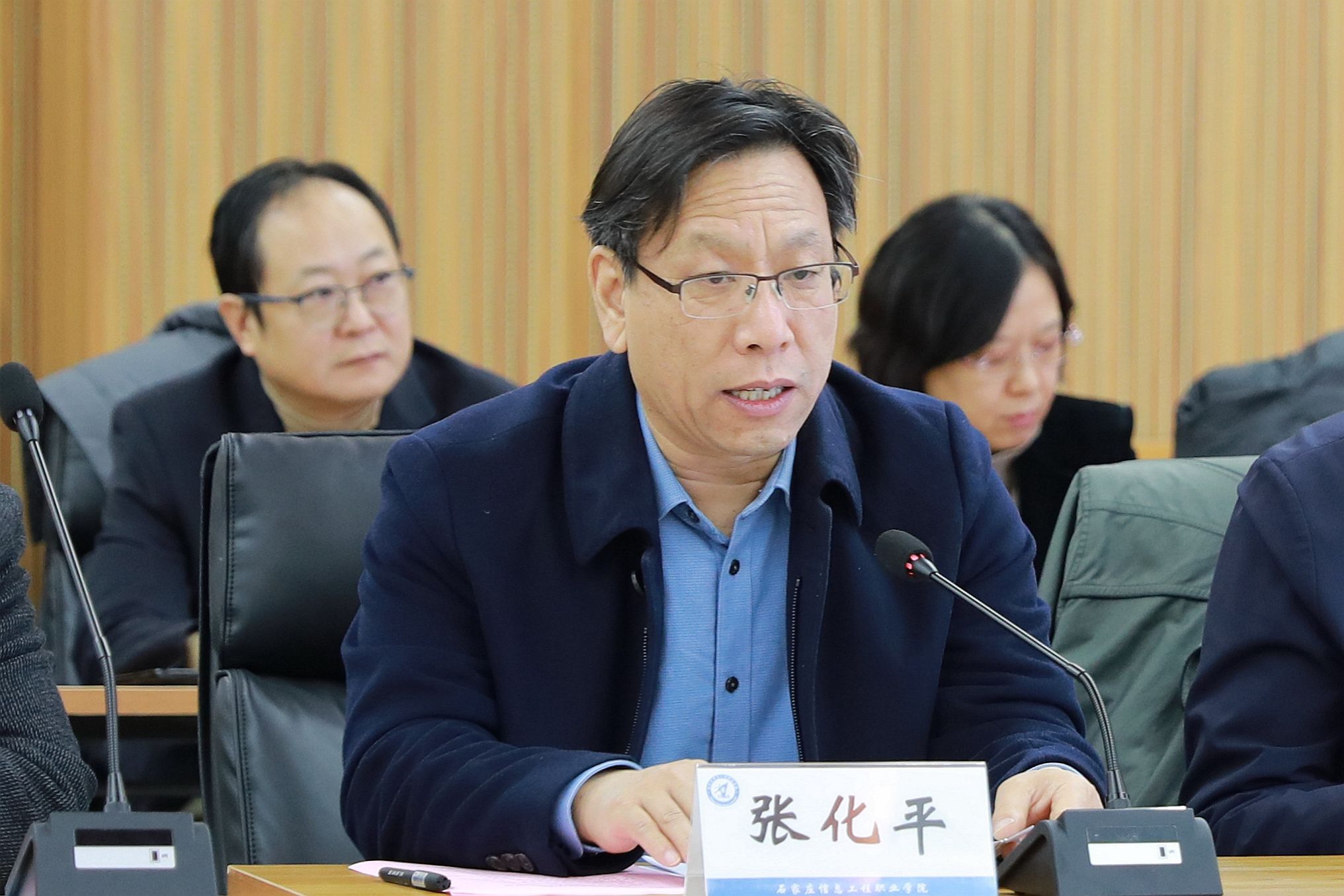 22日上午,专家组现场考察见面会在启智报告厅举行。河北省教育厅二级巡视员、职成教处处长张化平出席见面会并讲话。学院党委书记赵立芬致辞,院长许征程主持并作情况汇报。省教育厅职成教处副处长李辉及学院领导班子、全体中层干部参加。