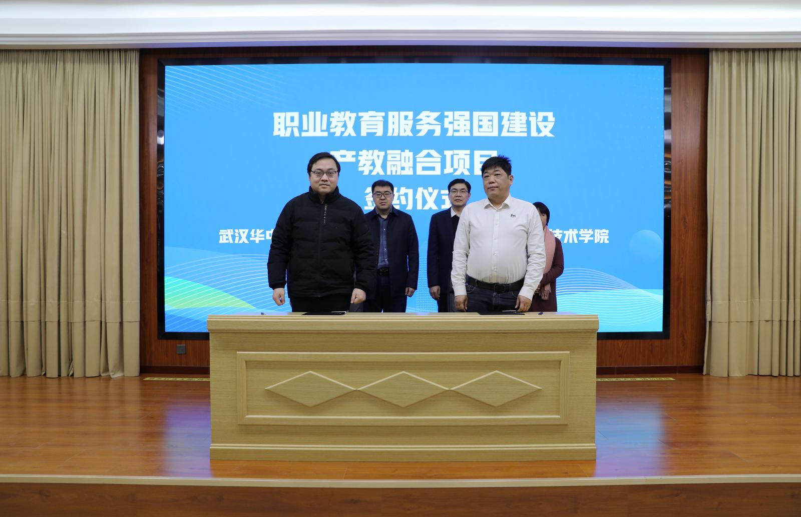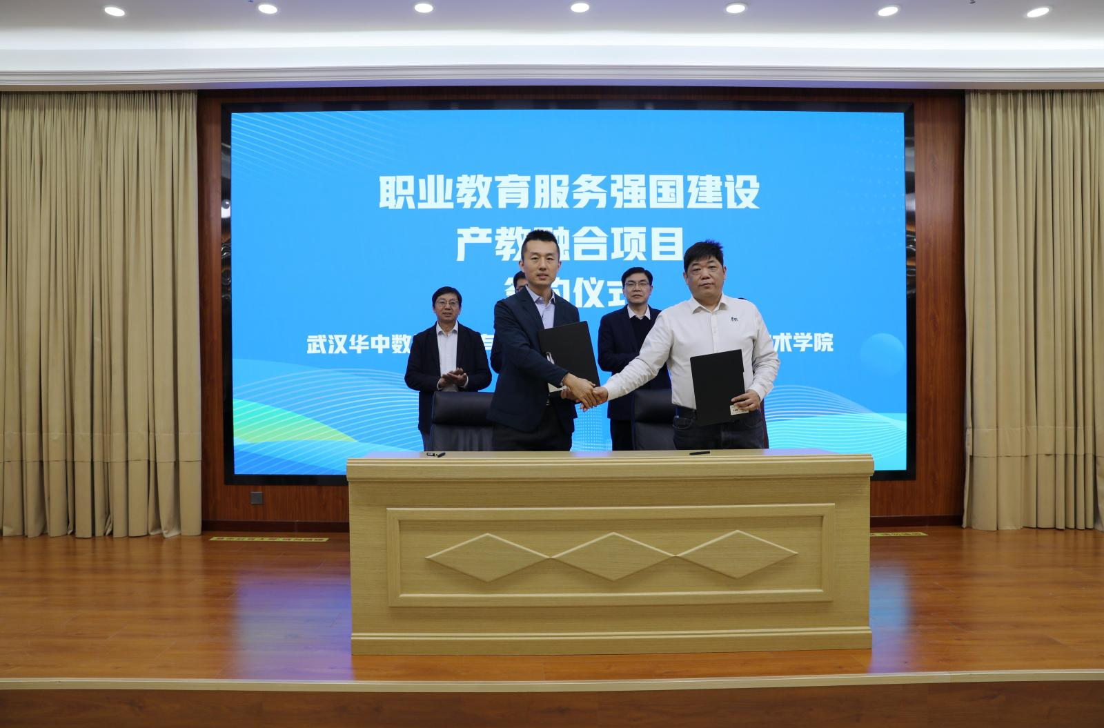 项目签约环节,河南工业职业技术学院、武汉船舶职业技术学院、广州铁路职业技术学院、重庆工业职业技术大学、河北机电职业技术学院、无锡职业技术大学院校代表与华中数控完成了职业教育服务强国建设产教融合项目签约。