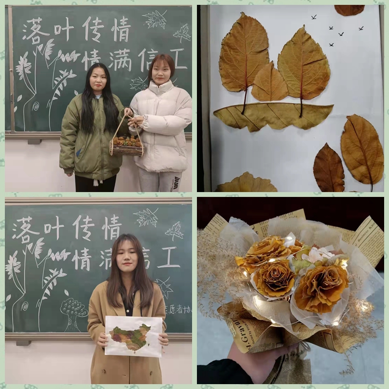 志愿者们将校园里的落叶变废为宝,发挥各自想象制作出了一件件富有创意的作品,让落叶成为传递祝福的载体,使温暖覆盖信工校园。