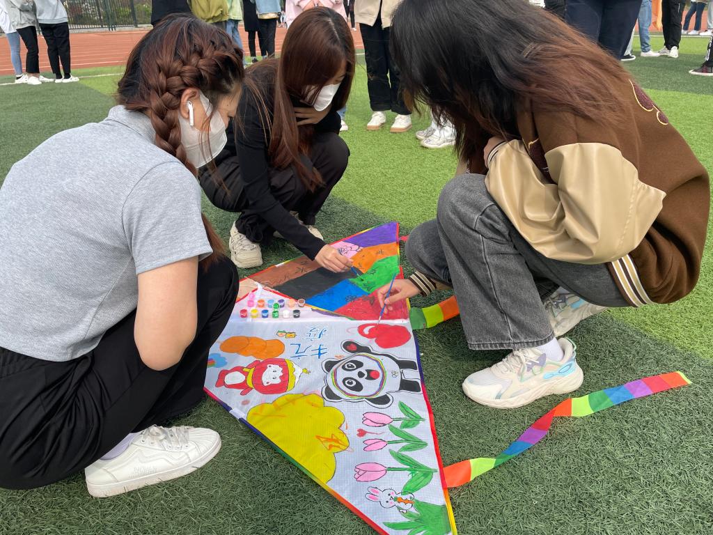 本次风筝节活动主要分为DIY绘画设计和风筝放飞两个环节。天马行空的想象在同学们的画笔下呈现出不同的造型,有倡导绿色文明的“手掌画”、形态各异的漫画人物、坚定信念的抗疫场景、还有憨态可掬的冰墩墩、雪容融……纷纷跃然纸上。