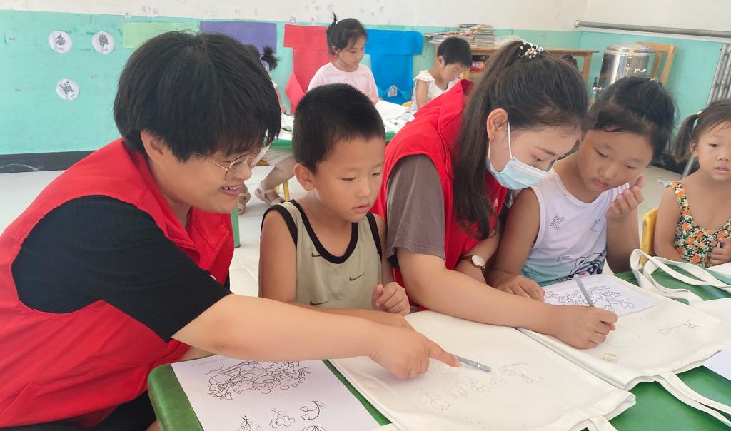 “筑美乡村 艺路向阳”社会实践小分队立足于专业特长在东纪城村开展了文化下乡活动,以书法、绘画、剪纸艺术为载体,组建文化美育小组。系部书法社成员组成的“翰墨书香”小组教小朋友们学写毛笔字;具有绘画特长、设计特长的师生们组成 “彩绘DIY”小组,指导小朋友们在白色帆布袋上绘出“梦想”;王丽云剪纸技术技能大师工作室成员组成“剪纸颂党恩”小组,教小朋友们学习团花和党徽的剪法。通过学习传统文化艺术知识,并动手实践文创作品,加深了孩子们爱党爱国爱家乡的情怀。同时,各小组为该村留守儿童发放学习及体育用品,围绕学业辅导、健康教育等内容进行了互动。
