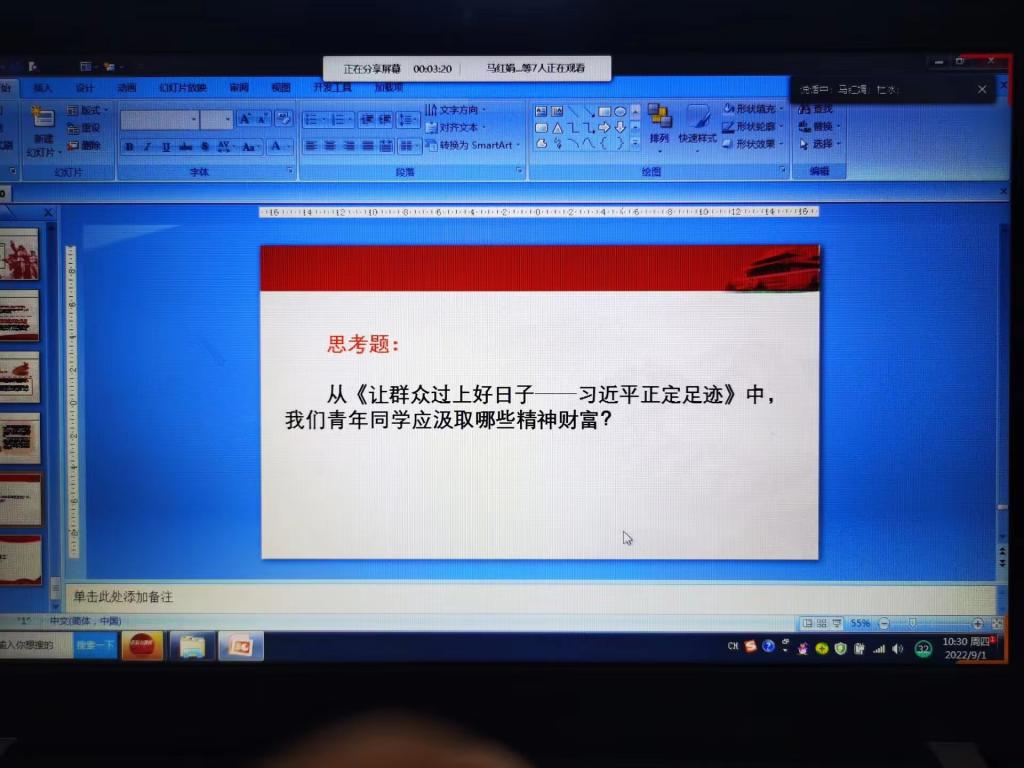 “很震撼,很感动,很振奋”“我将无我,不负人民”“我就是正定人,总书记在正定期间为正定人民做的事儿,每个正定人都铭记在心!”“总书记和正定人民一块苦、一块过、一块干,让我们深切感受总书记的为民初心”“作为新时代新青年,我们要以习近平总书记为榜样,奋进新征程,建功新时代!”……这些都是新学期《形势与政策》课开学第一课《让群众过上好日子——习近平正定足迹》课堂上同学们的由衷发言。通过教师的生动讲解,一个个真实生动的故事,一幕幕亲切感人的场景,展现在同学们面前,让大家循着总书记的足迹感受着深厚的为民情怀,伟大思想孕育发展进程和非凡人格铸就的精神伟力,引发深入思考,为大学生的成长成才提供了精神指引。虽然是线上教学,但隔着屏幕依然能够感受到同学们的学习热情和真情流露。