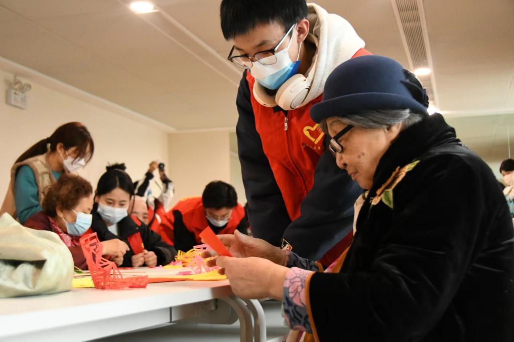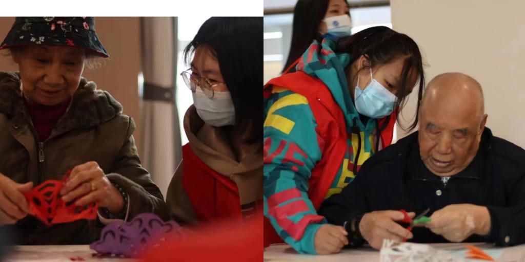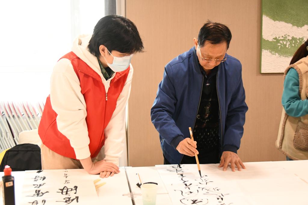 活动中,剪纸小组的同学们和老人一起剪窗花,通过耐心细致的示范和讲解,详细地展示剪窗花的各项步骤,老人们积极参与其中,一张彩纸、一把剪刀,在老人们的手中,经过折叠、描图、裁剪等工序,很快就变成为一幅幅惟妙惟肖、形象生动、内容丰富的精美窗花。书法小组的同学和老人一起探讨交流书法,此次活动吸引了很多热爱书法的老人参加。