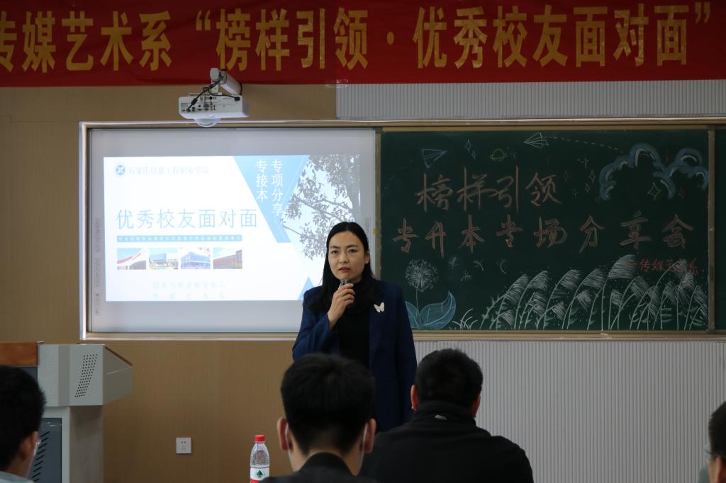 非学无以广才,非志无以成学。为帮助同学们树立目标,进一步激发学习热情,加深对专升本的认识,掌握备考技巧,4月26日下午,传媒艺术系举办了“优秀校友面对面”之专升本分享交流会。活动邀请了成功升入本科院校的2019级孟银霞、杨立浩两位优秀毕业生作经验分享。传媒艺术系负责人及部分师生参加了此次活动。