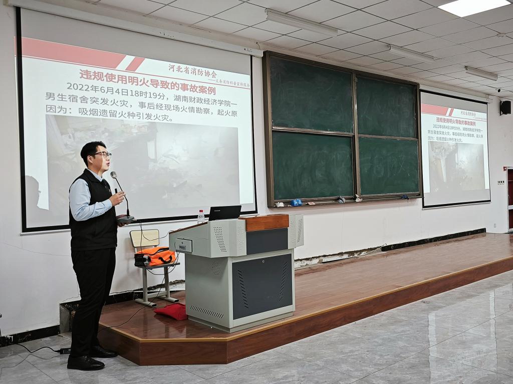 讲座中,孙浩天教官作为河北省消防协会的代表,以严谨、稳重、理性的风格,向同学们阐述了消防安全工作的重要性。他通过引用全国性的典型火灾案例,并利用视频案例进行讲解,使同学们更加直观地了解了火灾的危害和消防安全的重要性。