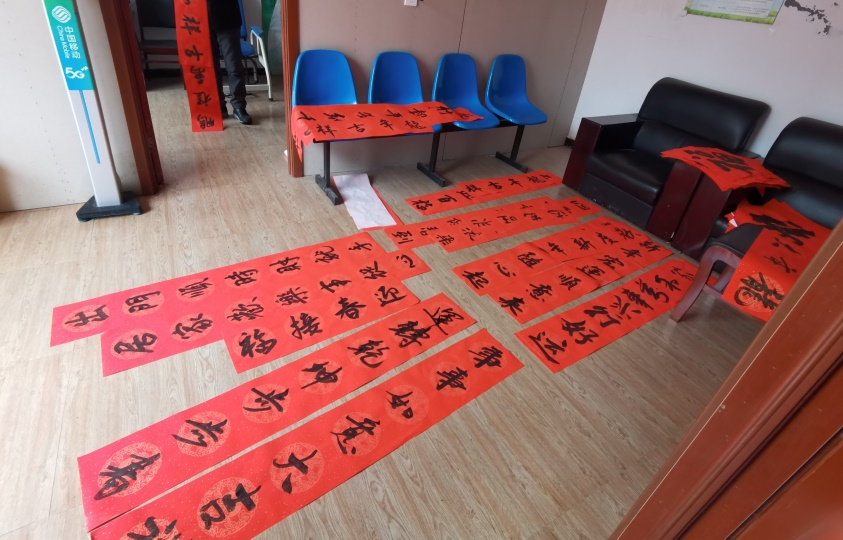 腊八节过后,春节的序幕缓缓拉开。冬日的转角沟村,苍山残雪,薄雾袅袅。虽然寒气清冽彻骨,但是丝毫没有抵挡住志愿者们的服务热情。到达目的地,志愿者们顾不上休息,第一时间便开始裁纸铺宣,倒墨润笔。挥毫列锦绣,落纸如云烟,不到一会儿工夫,便洋洋洒洒书写了上百副春联,村民们纷纷点赞,感谢志愿者们为他们送来的新春祝福。