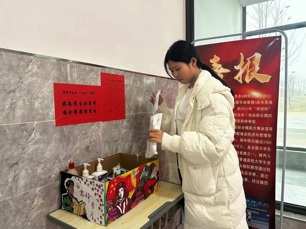经济贸易系在知新5号教学楼南门和北门分别设置了“安全药箱”,里面配备了碘伏、棉签、纱布、体温计、板蓝根、口罩等数十种应急药品及辅具,免费提供给有需要的学生。这一举措为给学生在上课期间突发状况提供更加便捷、贴心的服务,确保在紧急情况下能够及时得到救治。希望通过这样的方式,为大家营造一个更加安全、温馨的学习环境。