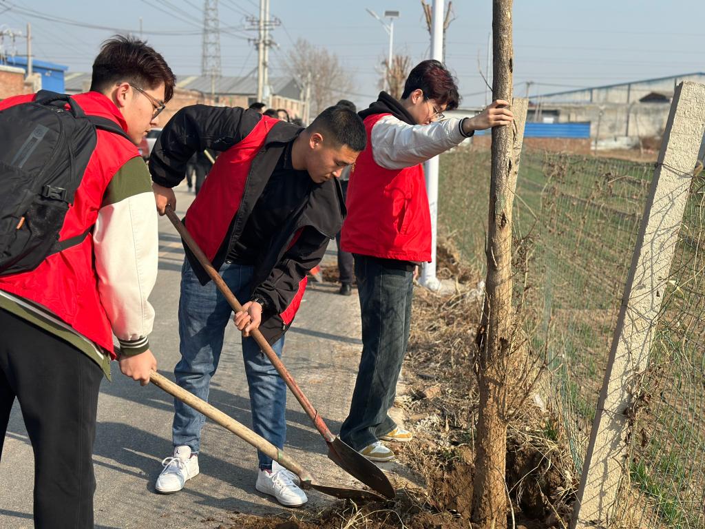 3月12日上午,三邱村村南路,志愿者们身穿红马甲,和附近村民共同组成植树队伍。大家三五一组,扶苗填坑、挥锹培土、踩实松土、拍平围埝……每一个环节都分工明确,配合默契,现场呈现出一派热火朝天的景象。经过一上午的辛勤付出,100棵国槐在微风中展现出勃勃生机,为裸露的土地披上一件“新衣”。
