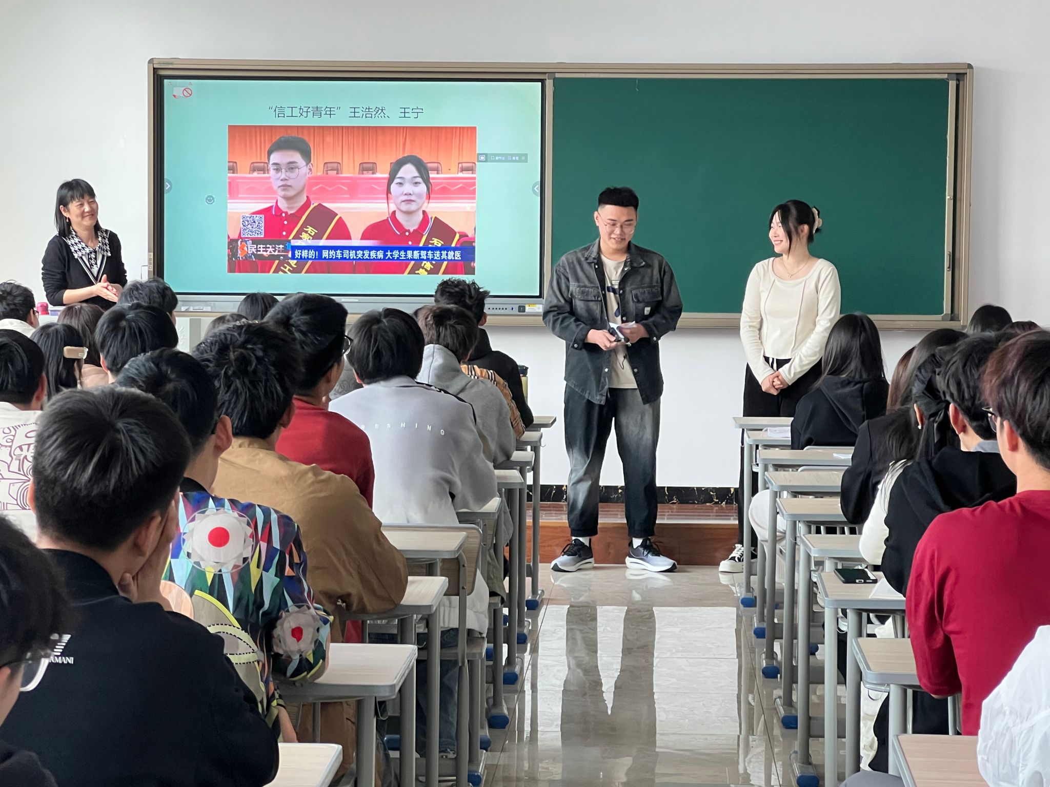 为落实立德树人根本任务,充分发挥思政课主阵地、主渠道作用,4月8日上午,“信工好青年”软件工程系2022级学生王浩然、王宁走进课堂,与《思想道德与法治》教研室主任孙静一起为2023级移动应用开发1班、2班学生上了一节精彩的思政课。马克思主义学院党总支书记陈新、院长李秋红、副书记刘从立随堂听课。