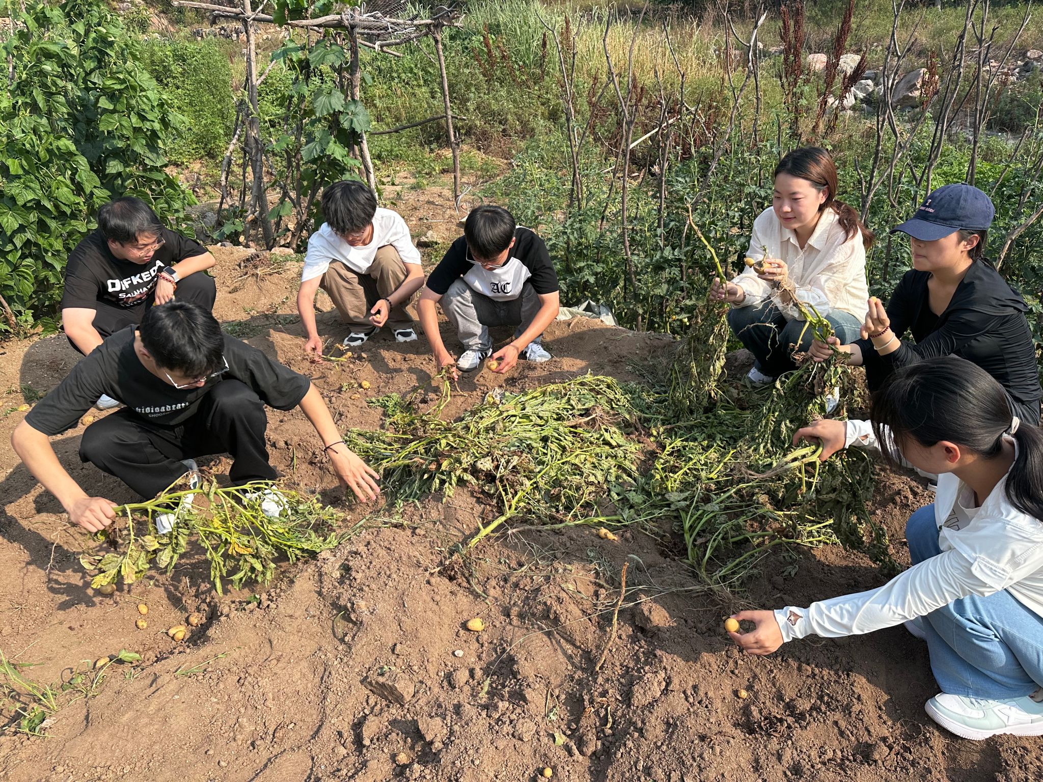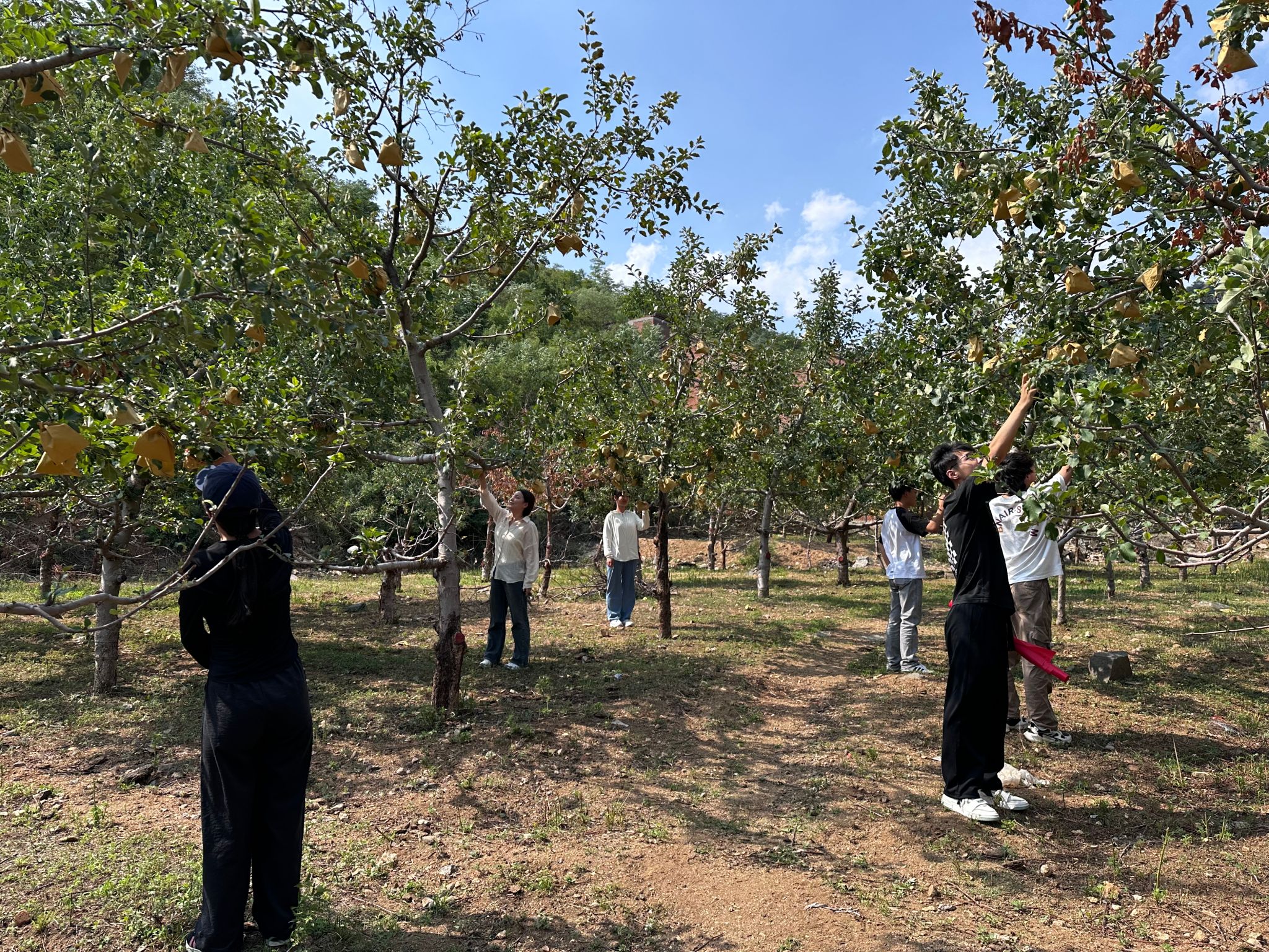 深入田间地头,体验劳动不易。团队成员深入田间地头,一边学习农业知识,一边进行农业劳动。通过帮助村民下地挖土豆、去果园采摘桃子、给未成熟的梨套上果袋这些农业劳动,亲身体验农耕劳作的艰辛与快乐。同时,通过直播方式推介当地特产,为果农拓展农产品销售新途径。
