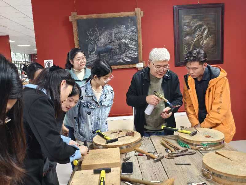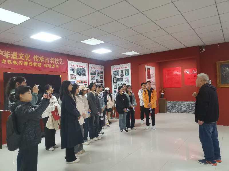 10月26日下午,学院传媒艺术系方士英石影雕技术技能大师工作室开展的2024年度“弘扬科学家精神 大国工匠进校园”活动第三期继续进行。信工师生走出校园,来到郭海龙铁板浮雕艺术馆,近距离领略“河北大工匠”的艺术魅力。