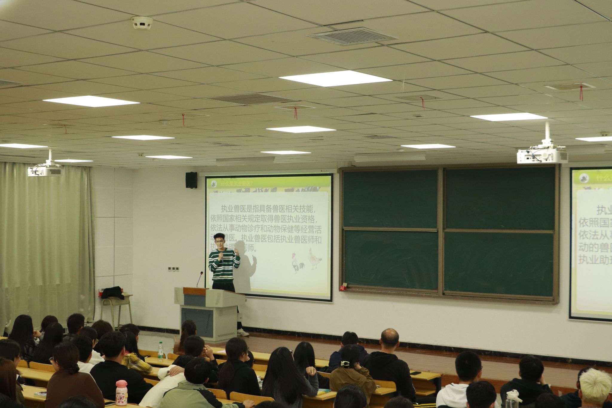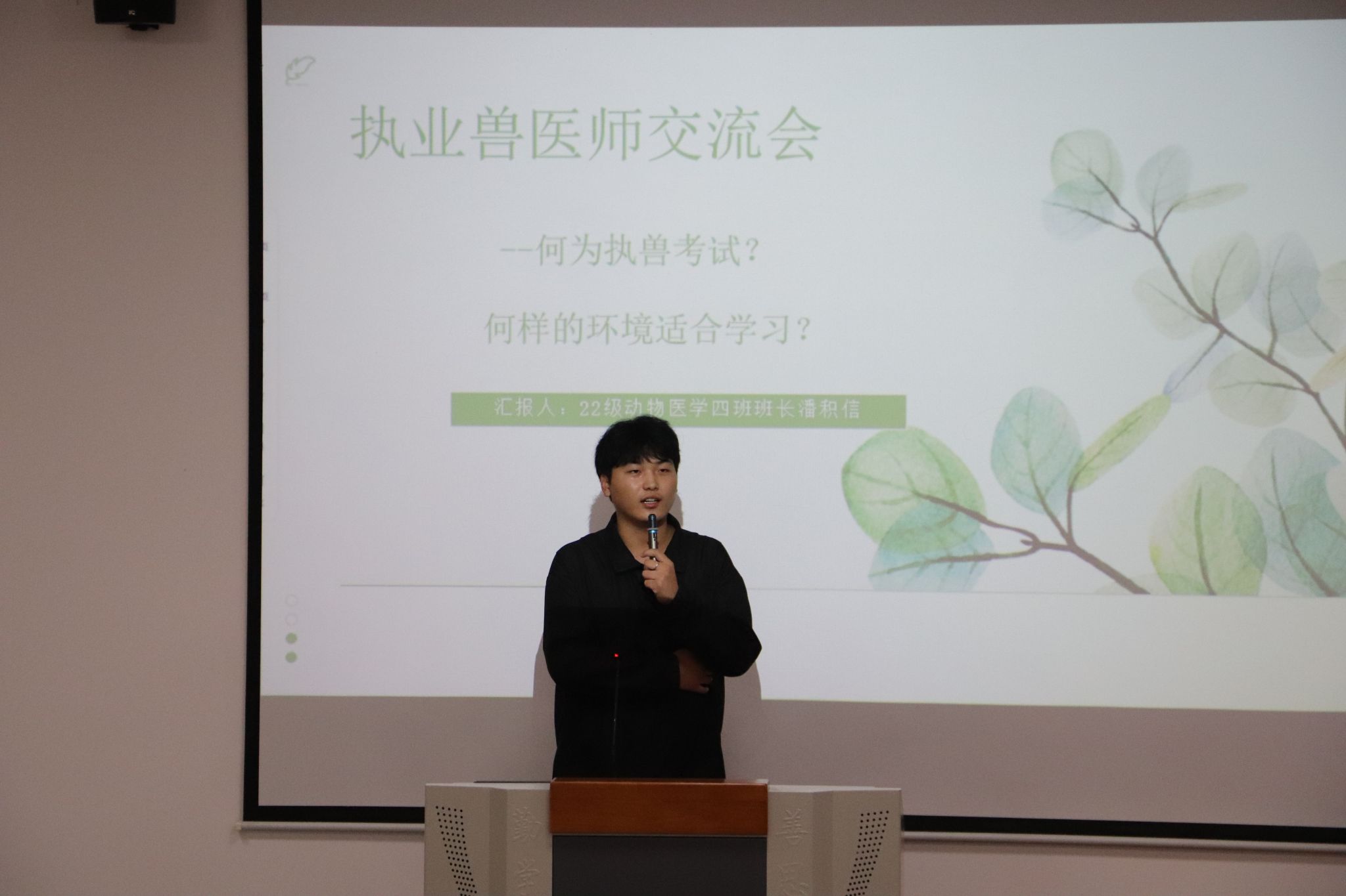 22级、23级徐浩、潘积信等八名通过执业兽医师资格证考试的学生代表,结合自己的学习技巧和备考经验,详细介绍了资格证考试的科目、形式和重点,讲解了基础、临床、预防、综合四科考试涵盖的主要内容,分享了学习经验,在备考过程中遇到的困难以及如何应对等方面内容。最后,八名学生代表与同学们进行了现场互动,对在场同学提出的问题进行了详细解答,现场气氛热烈,同学们热情高涨。