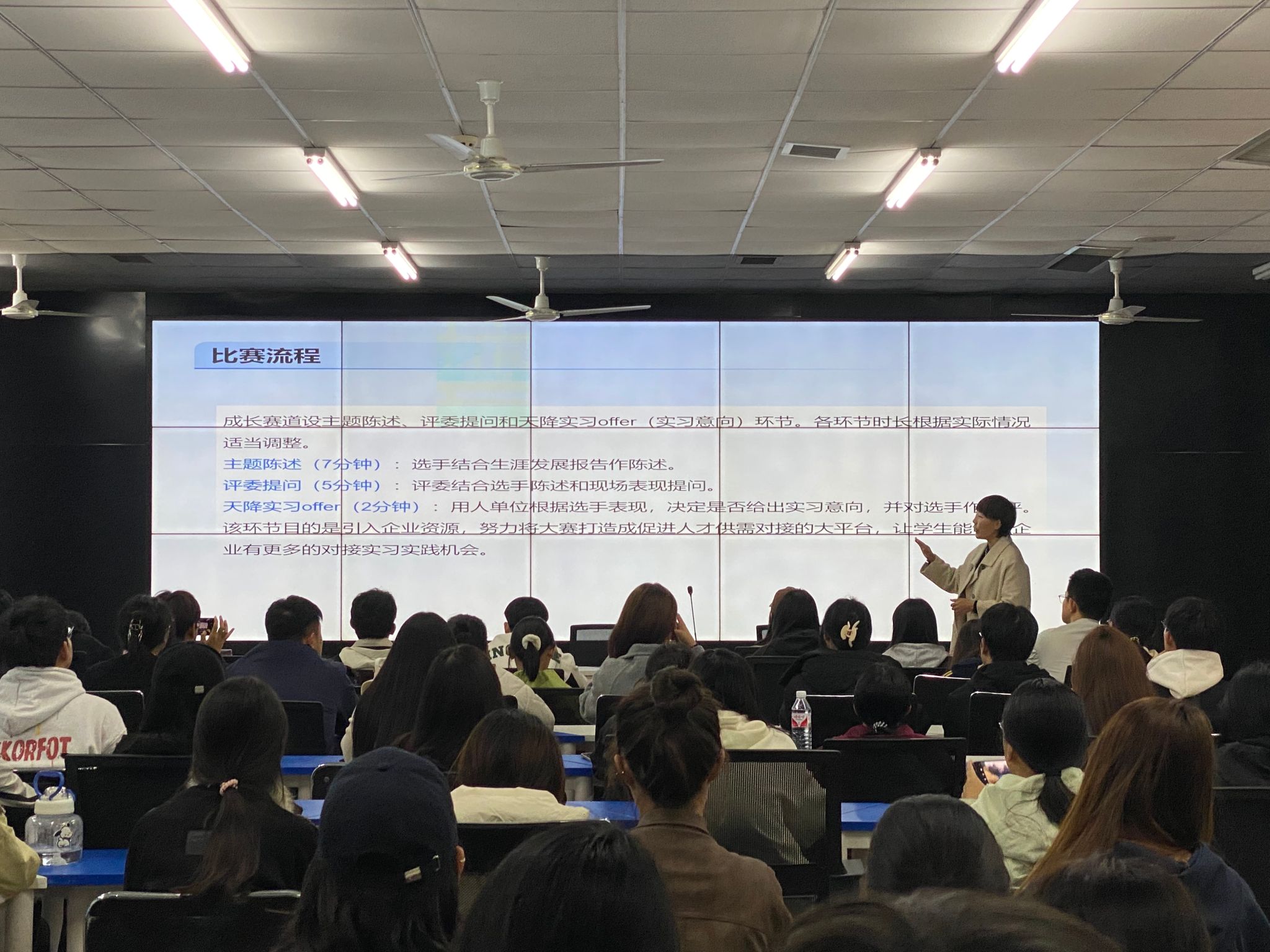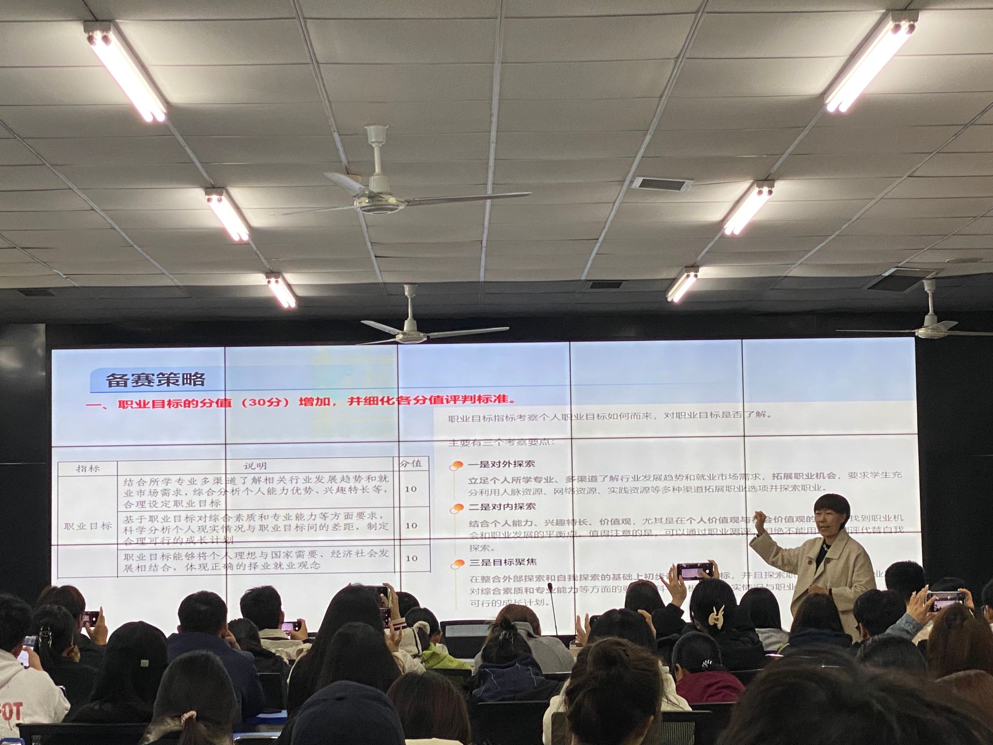 郑娇老师还详细解读了职业规划大赛的赛制与要求,结合往年的优秀案例,从自我评估、职业环境分析、职业目标设定、实施计划制定以及评估与调整等多个方面,为同学们提供了全面且实用的参赛指导。