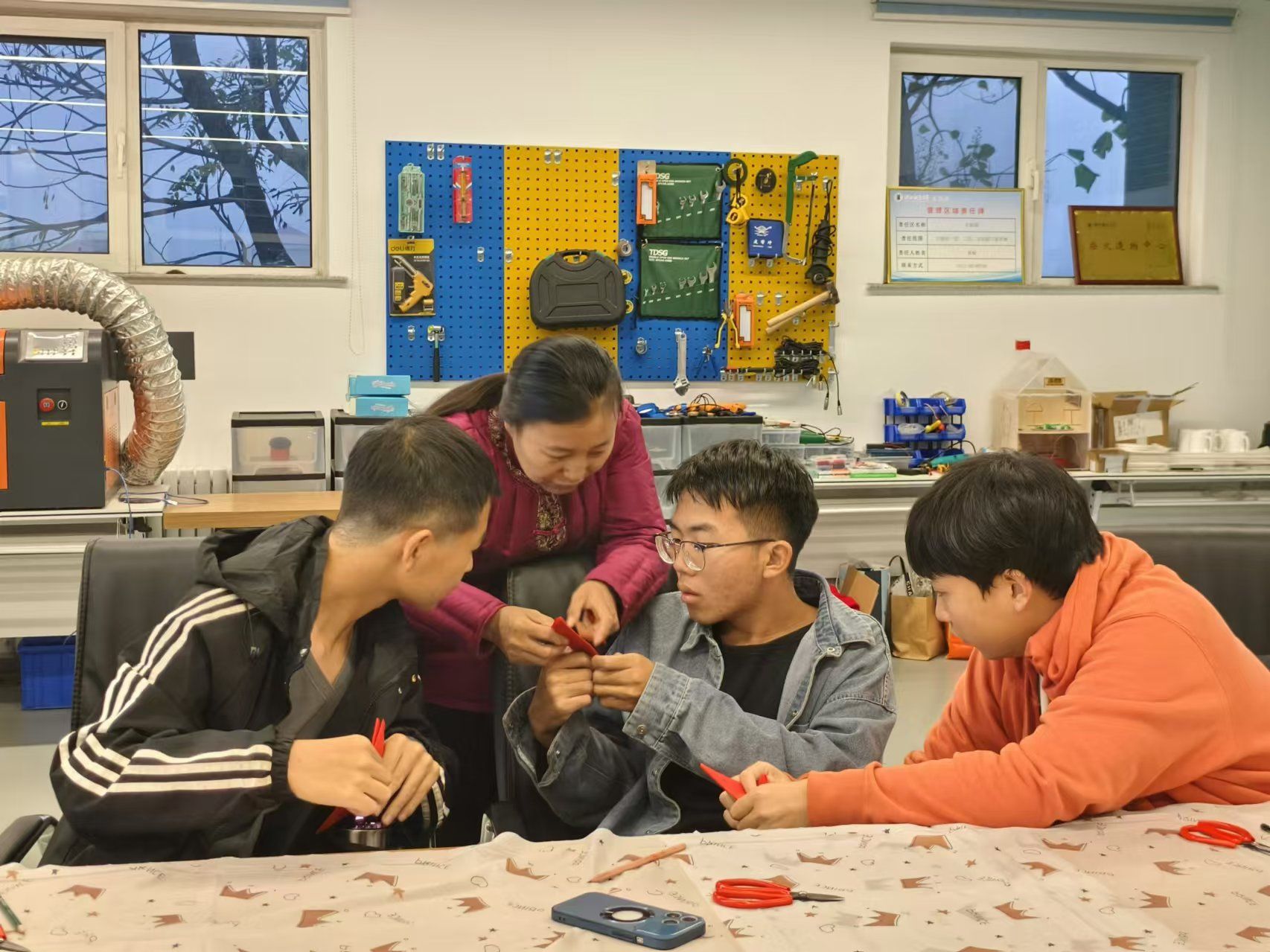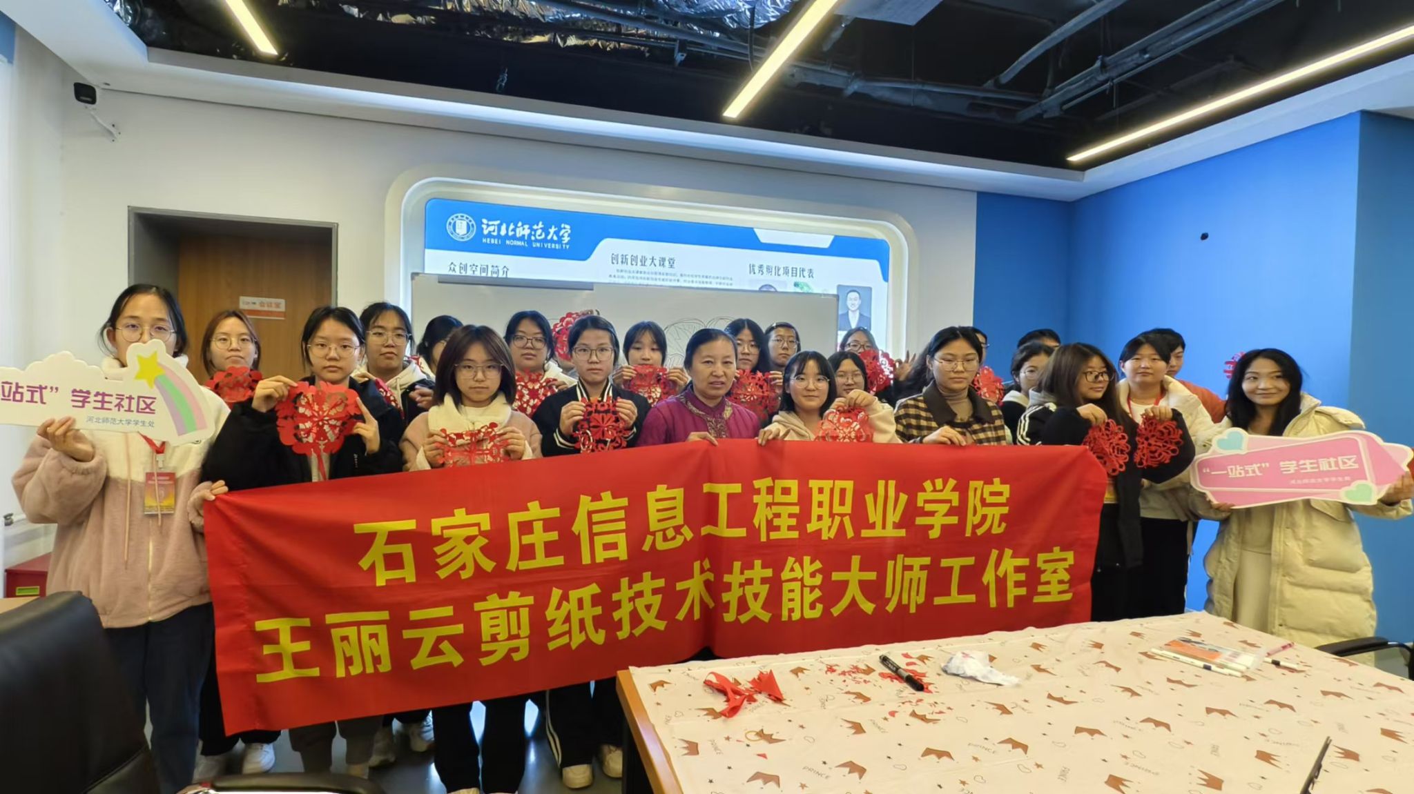 受河北师范大学学生处的邀请,11月13日晚,传媒艺术系王丽云剪纸技术技能大师工作室团队来到该校开展“心随手动”创意剪纸志愿服务。