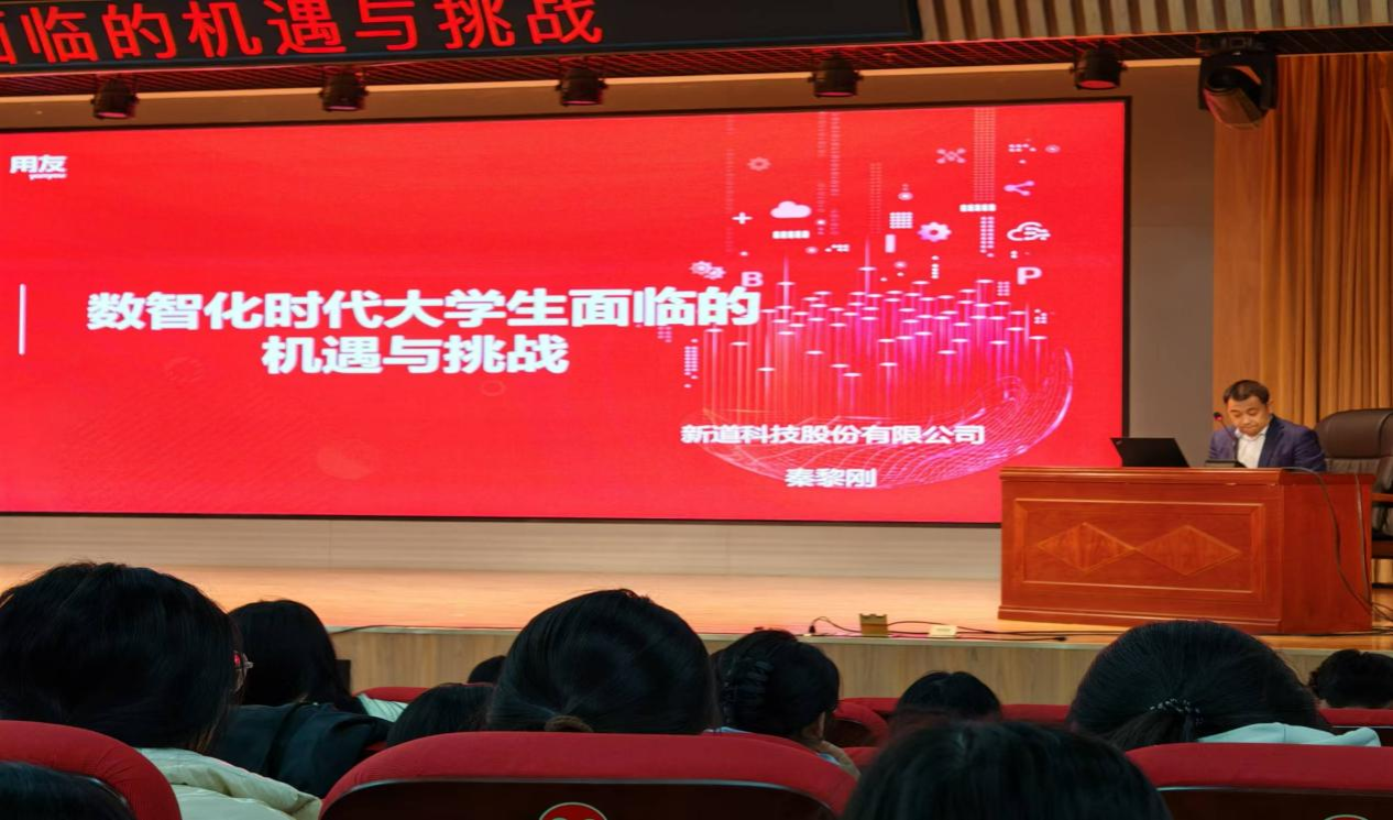 本次讲座旨在为同学们拨开数智化浪潮的迷雾,助力其走好职业生涯的第一步,推动系部专业建设高质量发展,就业水平再上新台阶。讲座邀请了行业领域的知名专家——新道科技股份有限公司华北区副总经理秦黎刚作为主讲嘉宾。秦黎刚通过丰富案例展示了数智化在各领域的广泛应用,指出随着移动互联网、大数据及云计算等技术的飞速发展,数智化已经成为社会发展的必然趋势。随后,秦黎刚又从多维度深入剖析了数智化时代大学生面临的诸多机遇与挑战。一方面,数智化为大学生提供了更加多元化的学习方式和资源,未来的就业空间更加广阔,职业定位更加多元。另一方面,大学生必须保持终身学习的态度,培养社交主动性,具备独立思考和跨学科知识与技能,才能在激烈的就业竞争中脱颖而出。其深入浅出、旁征博引、幽默诙谐的讲解赢得了在场师生的阵阵喝彩。