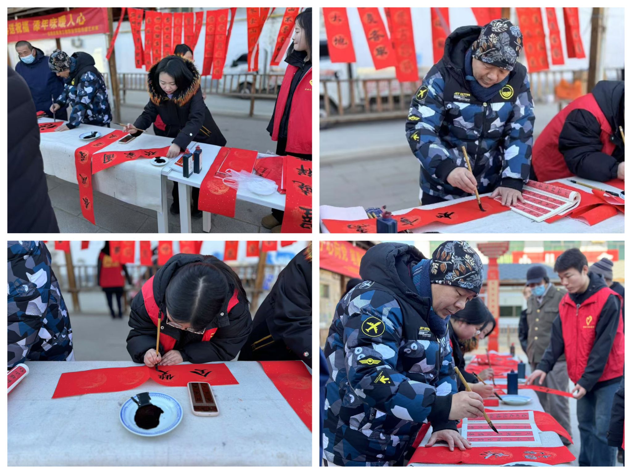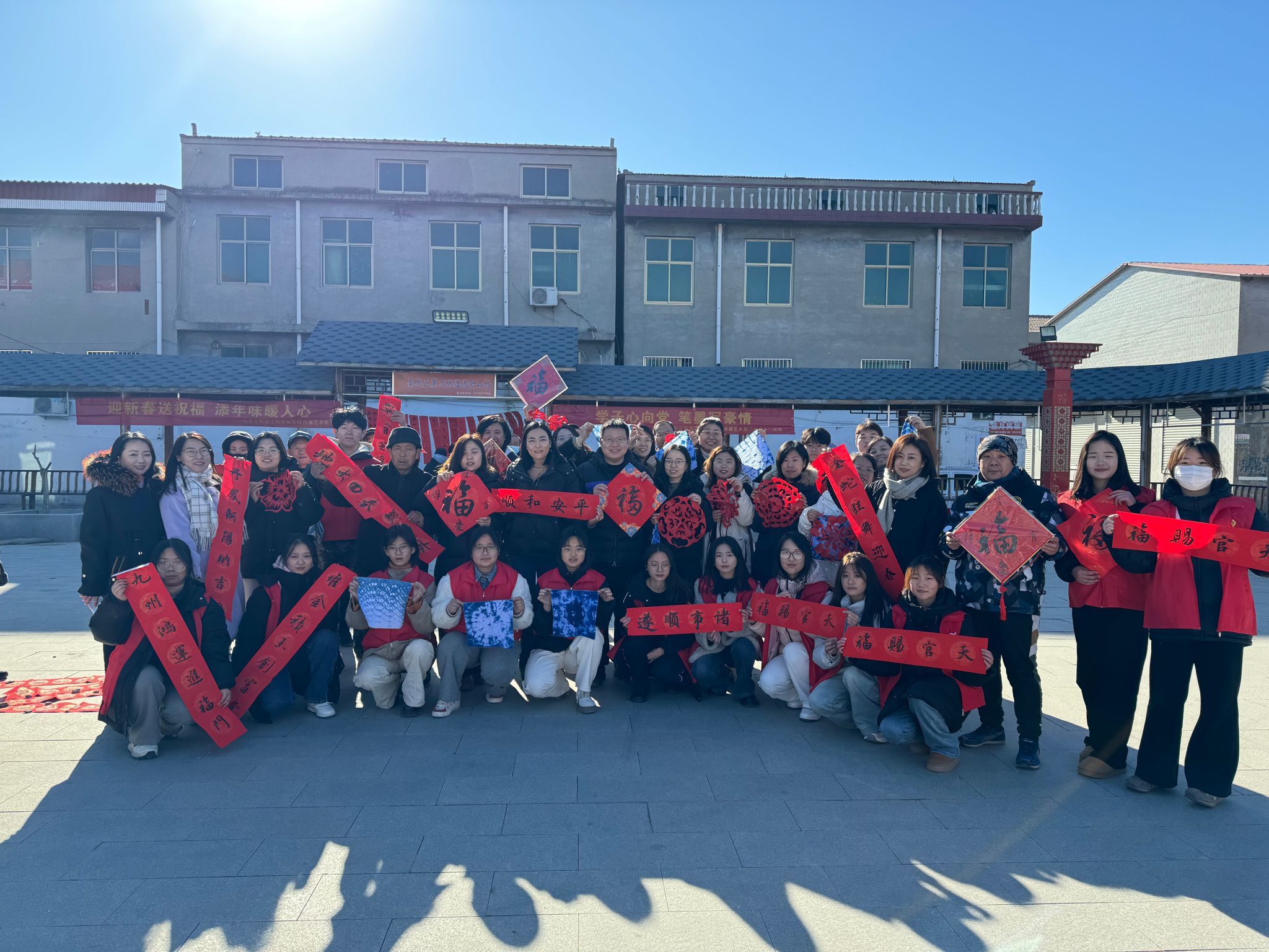 活动现场,传媒艺术系师生,挥毫泼墨,笔走龙蛇,小篆、隶书、行书、楷书等多种字体各展风采。一副副寓意吉祥、喜庆的春联在他们的笔下一挥而就,满载着对新年的美好祝愿。与此同时,广场的另一边,师生为乡亲们带来的扎染、剪纸等民俗表演也在精彩上演。他们还将这些传统手工艺的制作技巧耐心地教授给乡亲们。