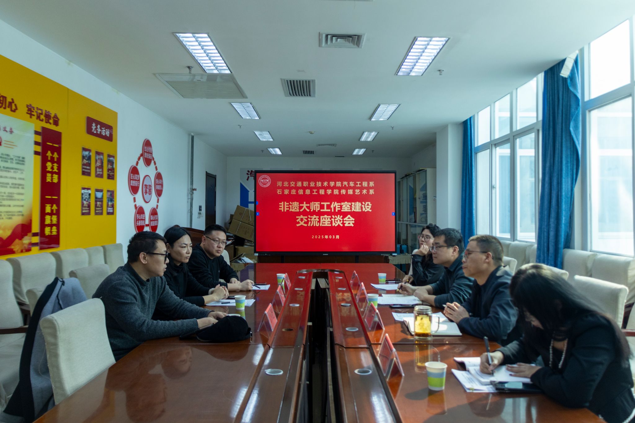 党建引领,结对联建,共谋发展。为强化校际之间交流,进一步发挥党建工作引领作用,推动党建和业务深度融合,近期,传媒艺术系党总支书记张婷,副书记刘旭,木艺文创工作室负责人孟松松赴河北交通职业技术学院开展党建联建交流研讨活动。河北交通职业技术学院汽车工程系党总支书记苏士杰,副书记赵海宾,金永祥非遗漆器大师工作室负责人刘欢欢,团总支宣传委员王首敬热情接待。