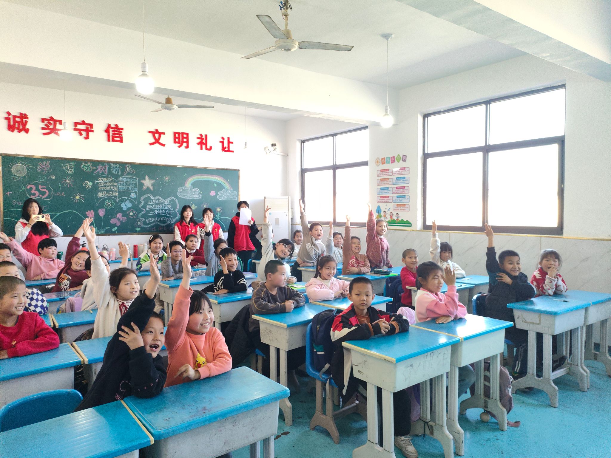 “学习雷锋好榜样,忠于革命忠于党,爱憎分明不忘本……”藁城区张家庄镇赵庄村小学三年级(1)班教室传出阵阵歌声,这里正在进行一场别开生面的“追锋”红色课堂。近日,网络与通信工程系宣讲小组的志愿者们用“青言青语”为同学们创新演绎雷锋精神,架起红色传承的桥梁。