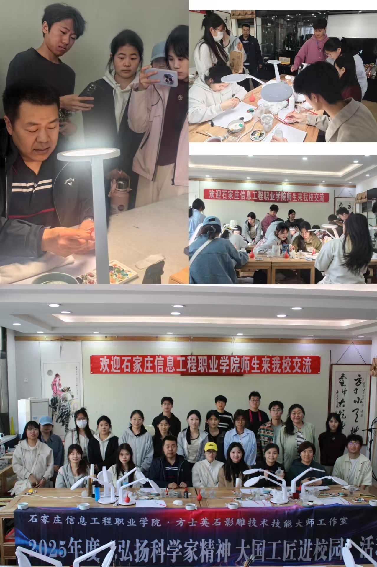 3月24日,传媒艺术系方士英石影雕技术技能大师工作室举办的2025年度“弘扬科学家精神 大国工匠进校园”第二期活动在衡水职业技术学院民族技艺大师工作室举办。信工师生走进省级技能大师工作室,与河北省工艺美术大师、河北省突出贡献技师李纪华老师深入交流,并体验了冀派内画、武强木板年画、衡水剪纸三种非遗技艺。