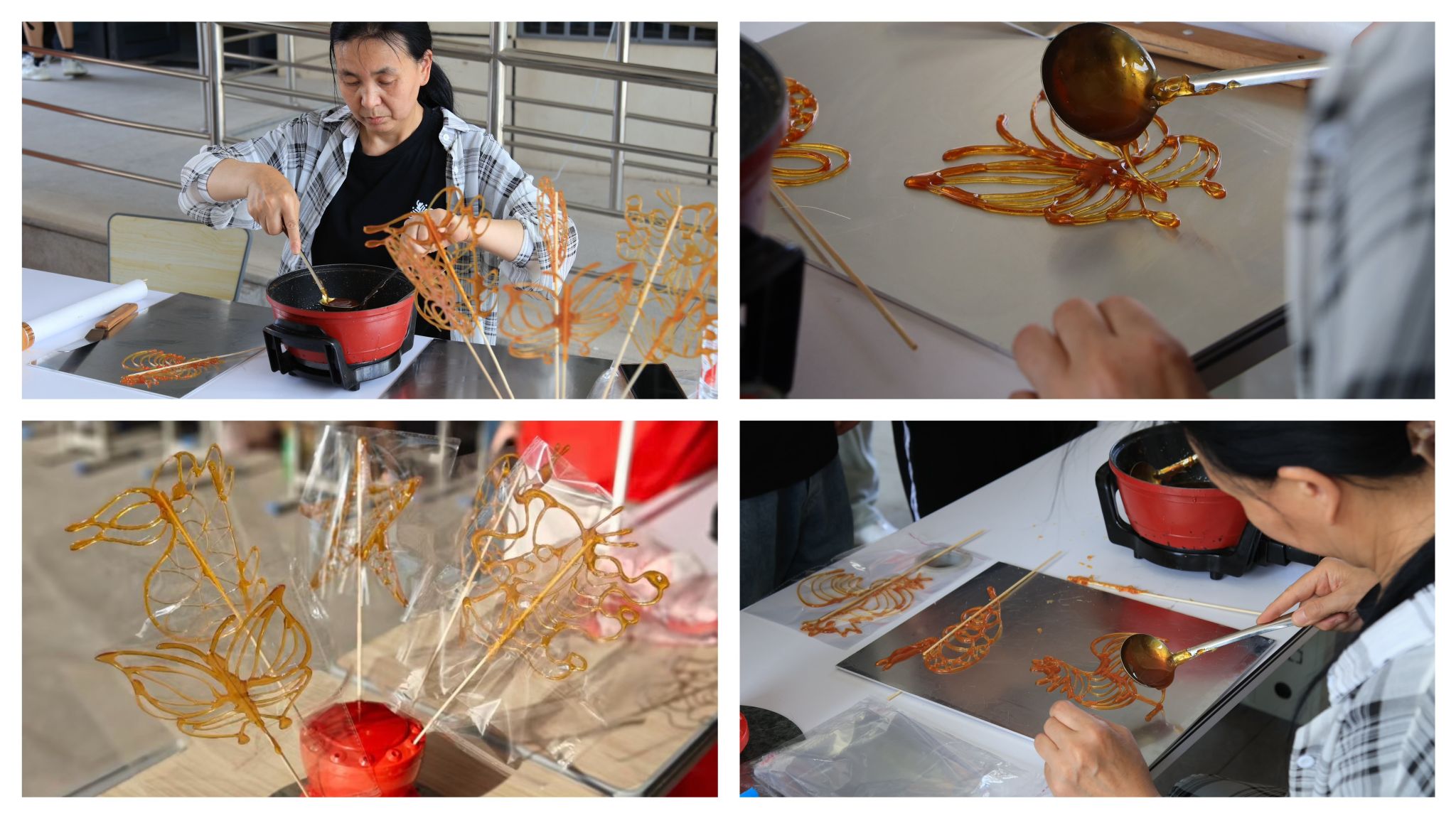活动现场,糖画、漆扇、扎染、种子画、剪纸、绳结等丰富多彩的非遗项目展区依次排开,各具特色,宛如一幅绚丽多彩的传统文化画卷。首日,糖画展区成为一大亮点。传媒艺术系特别邀请了非遗糖画艺人亲临现场,艺人手持小汤勺,舀起熬制好的糖汁,在石板上飞快地来回浇铸,短短几分钟,生动形象的花鸟鱼虫、神话人物等糖画作品便跃然眼前,引得师生们纷纷驻足观看,赞叹不已。随后,艺人还耐心地指导师生们亲手制作糖画,大家纷纷拿起工具,尝试着将甜蜜与创意融合,现场充满欢声笑语。