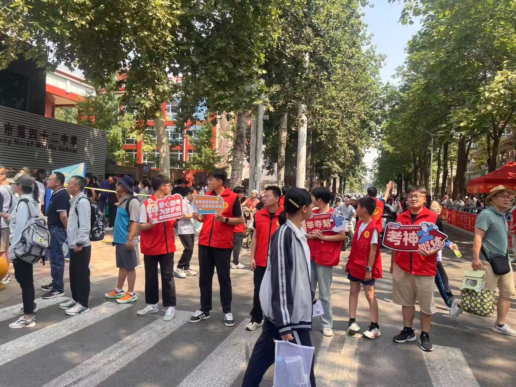 在活动现场,身着红色马甲的志愿者们早早到位,以饱满的热情投入到服务中。志愿者们在石家庄市第四十二中学考点周边设立志愿服务站,为考生和家长们免费提供签字笔、2B铅笔、橡皮等考试文具和饮用水、防暑药品、急救包等应急物资。志愿者们还主动承担起维持秩序的任务,疏导考点周边的交通,确保道路畅通无阻,为考生营造安全、有序的考试环境。